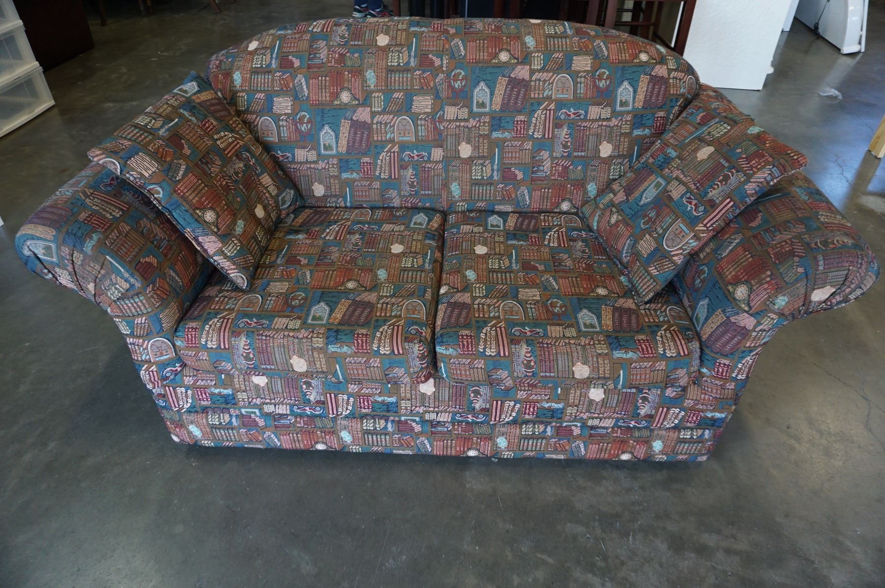 UPHOLSTERED LOVE SEAT W/ BOOKSHELF PATTERN FABRIC