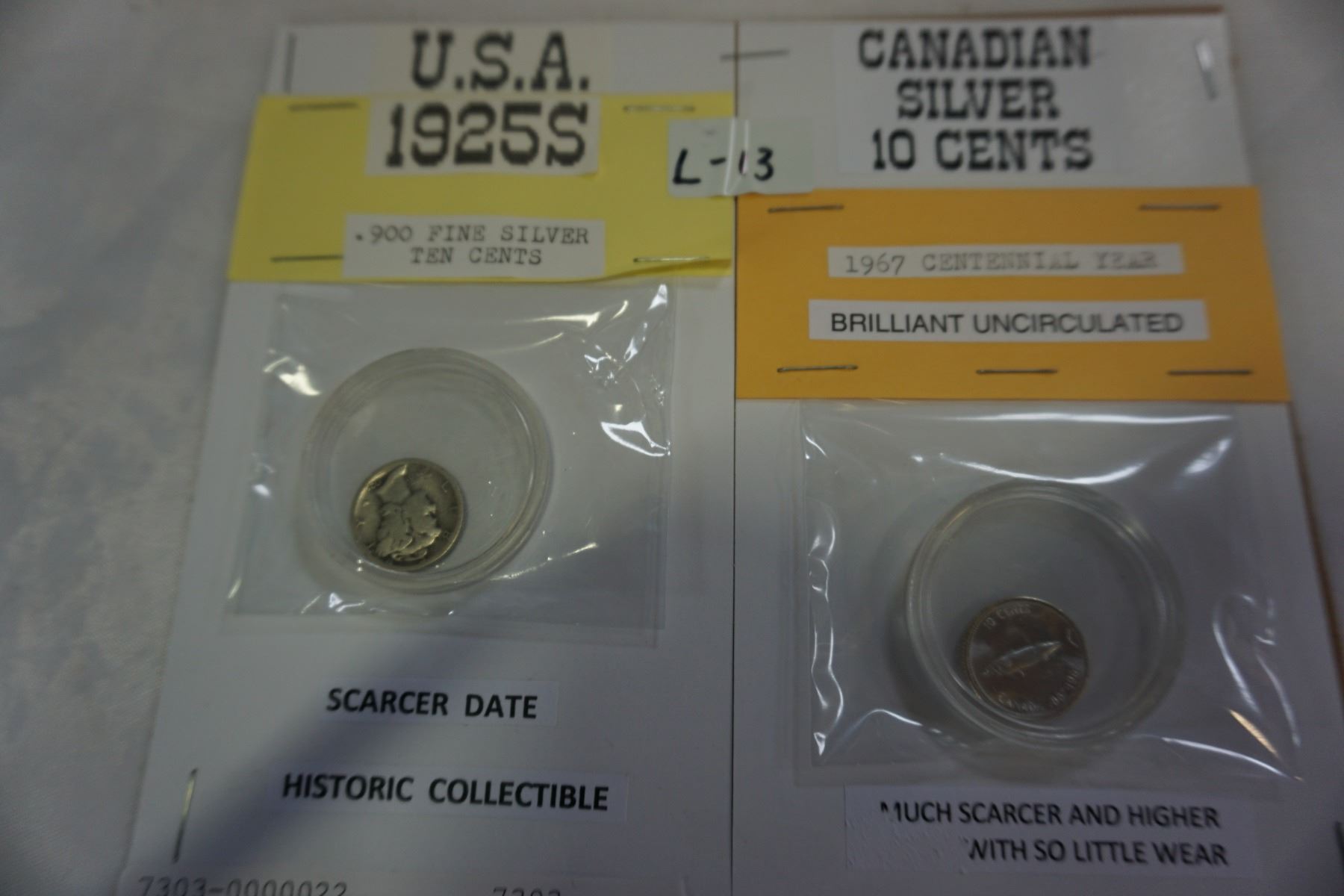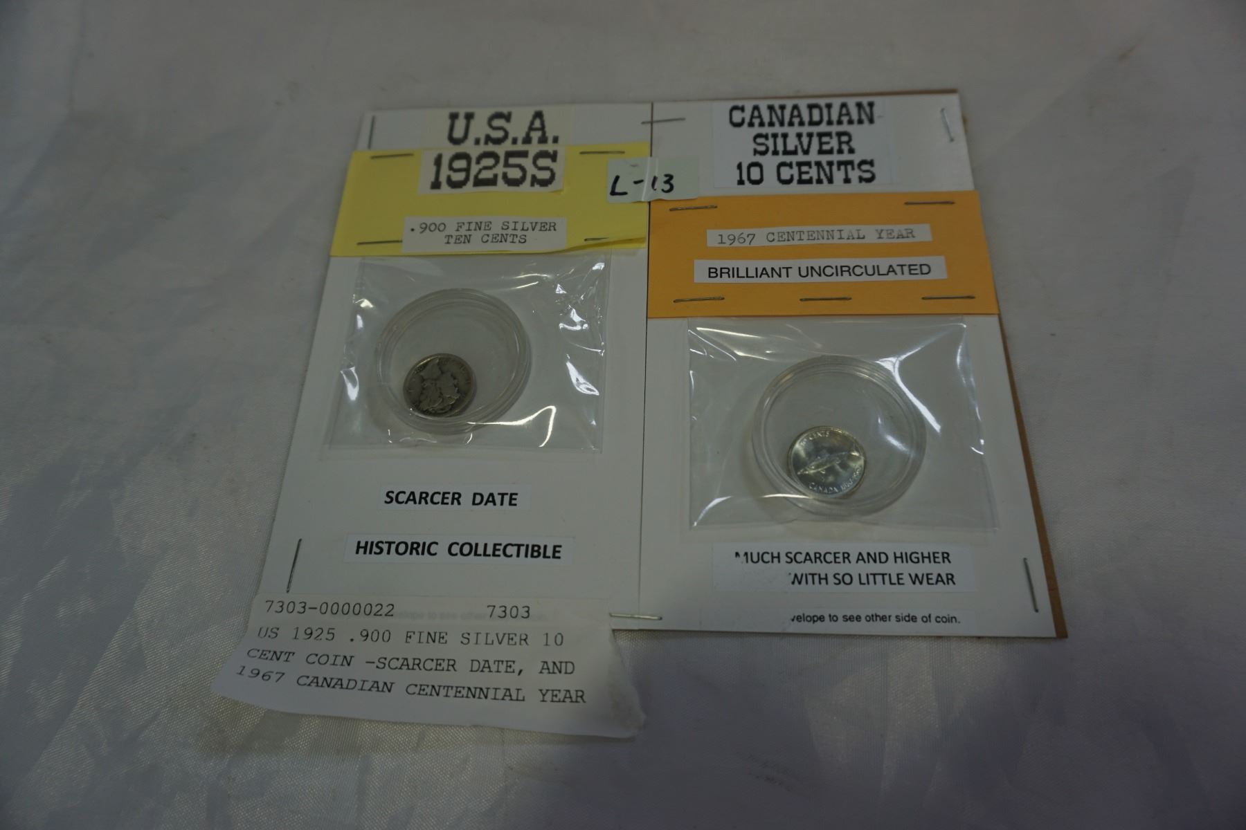 US 1925 .900 FINE SILVER 10 CENT COIN -SCARCER DATE, AND 1967 CANADIAN CENTENNIAL YEAR SILVER 10 CENT COIN - UNCIRCULATED
