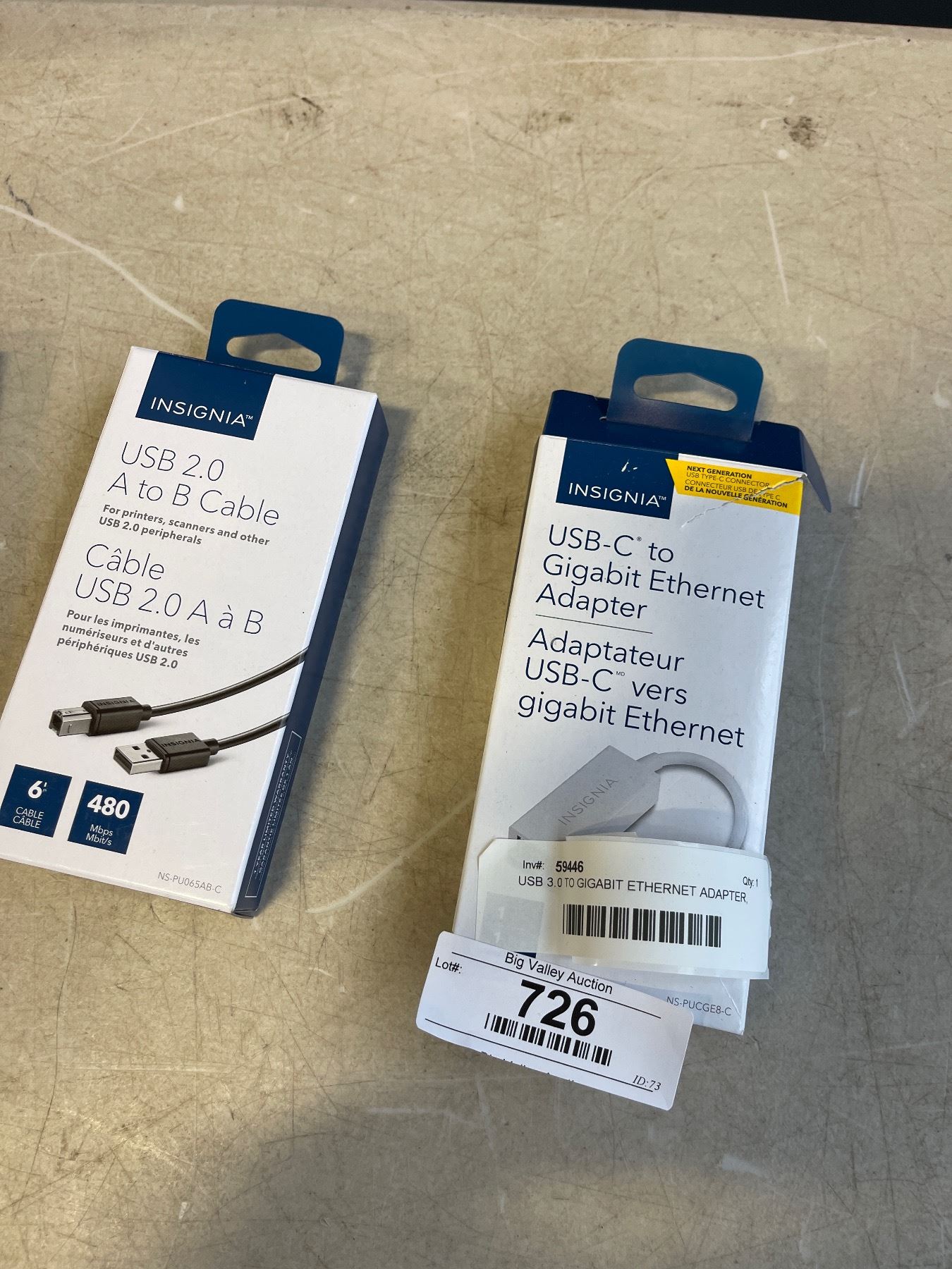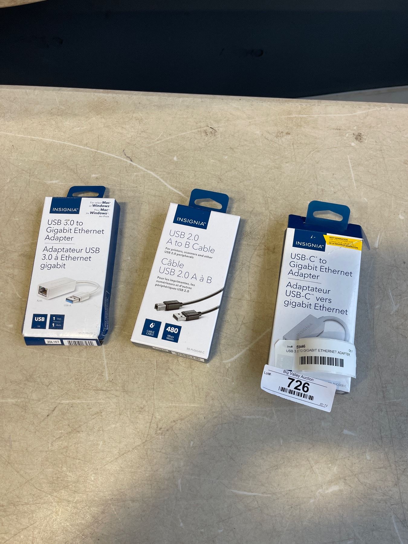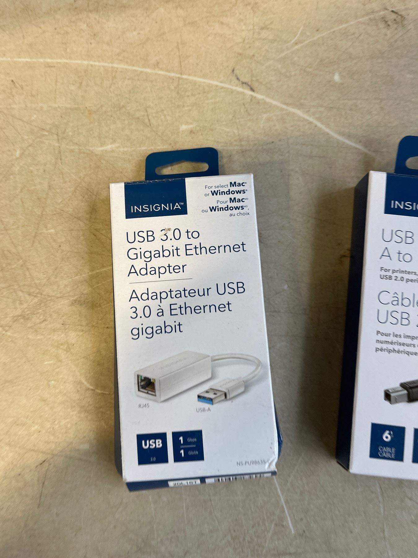 USB 3.0 TO GIGABIT ETHERNET ADAPTER, USB 2.0 A TO B CABLE, AND USB-C TO GIGABIT ETHERNET ADAPTER