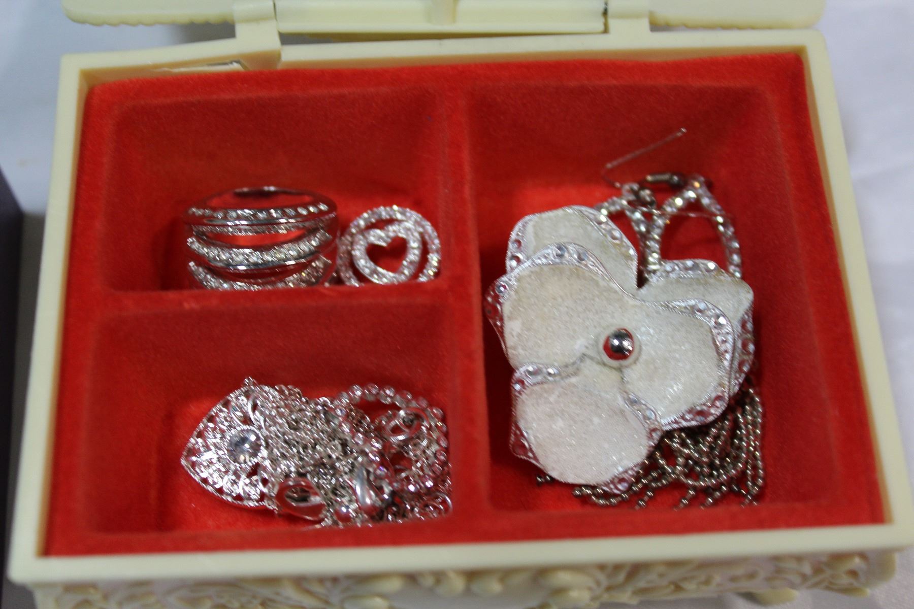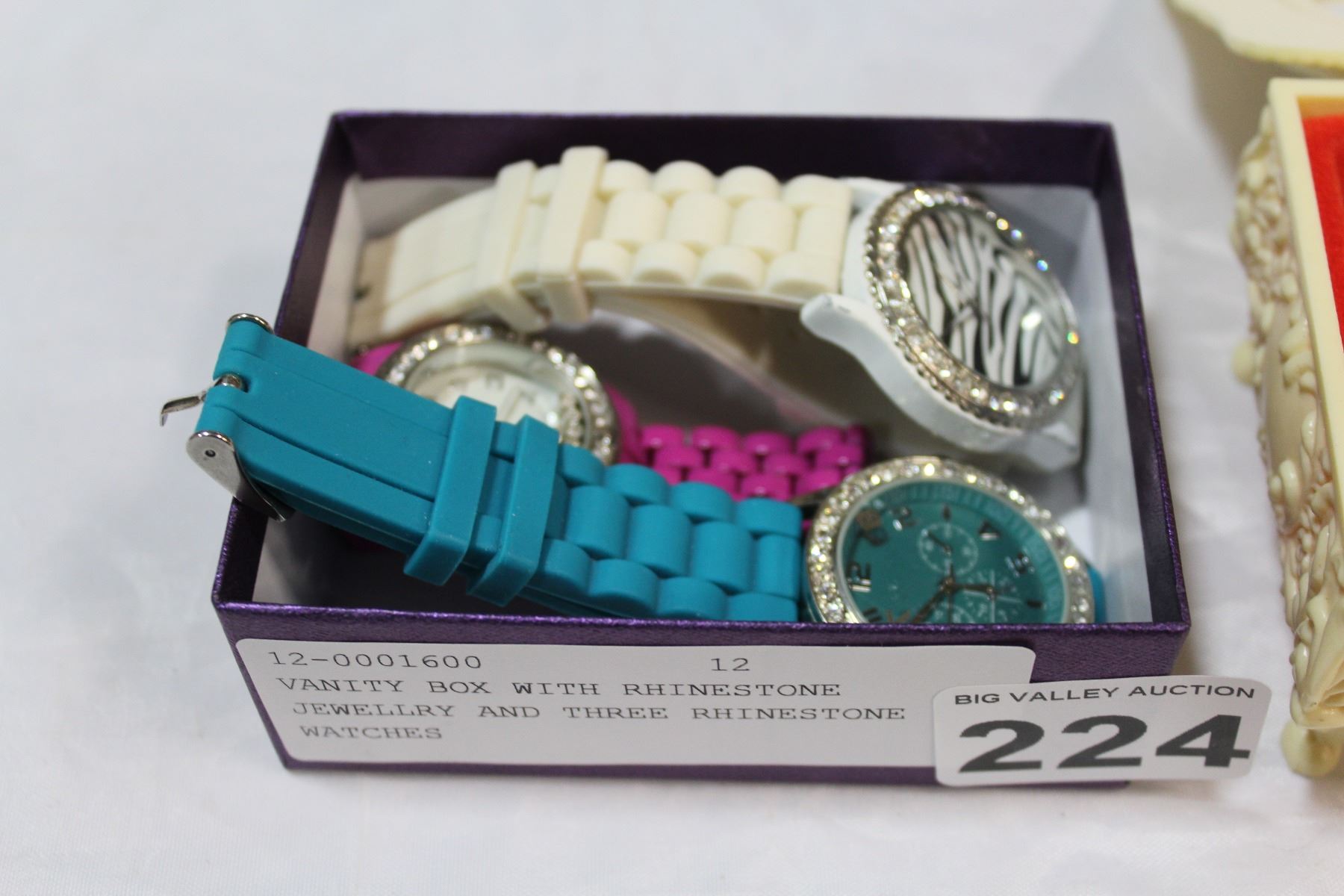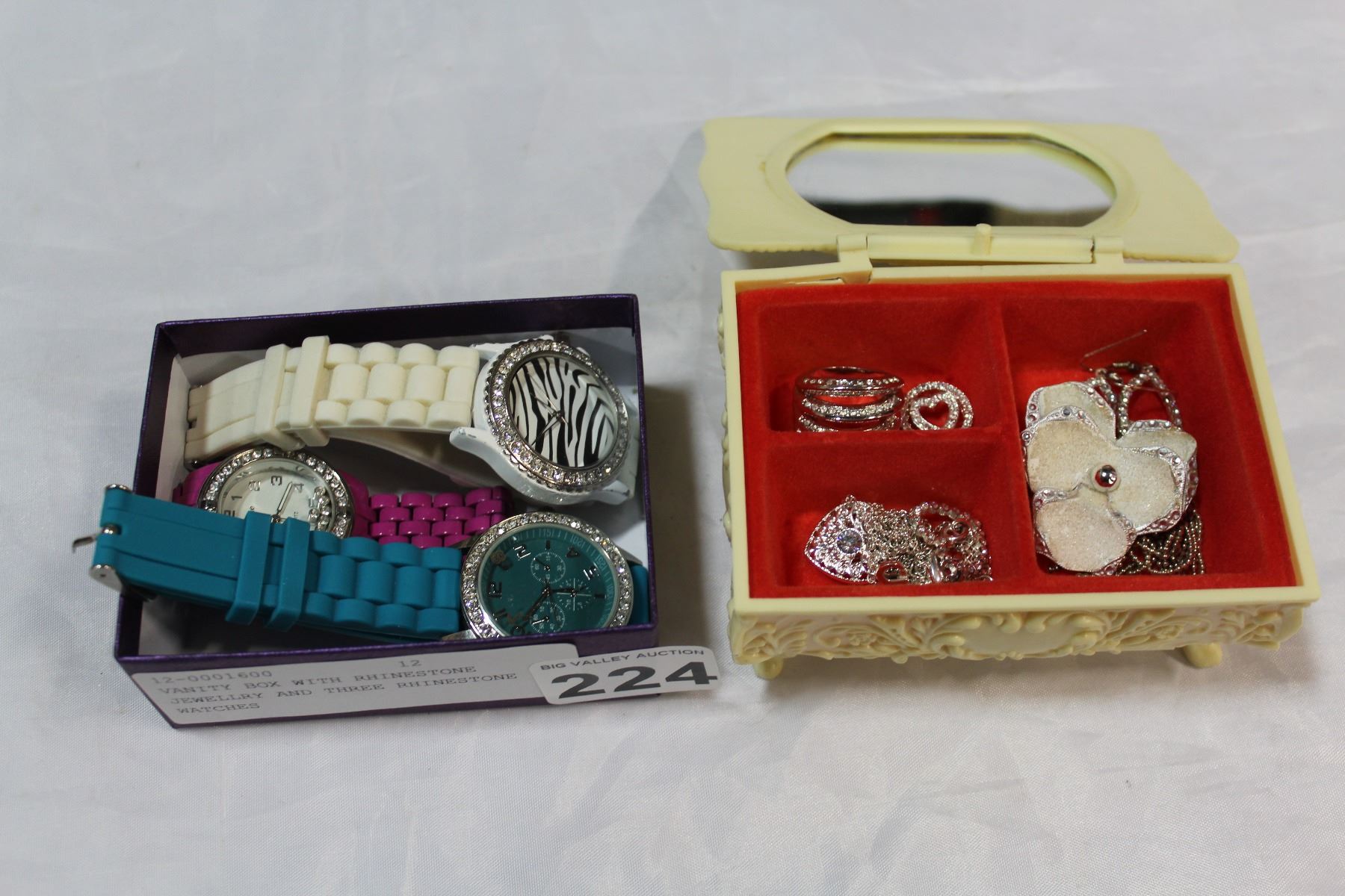VANITY BOX WITH RHINESTONE JEWELLRY AND THREE RHINESTONE WATCHES