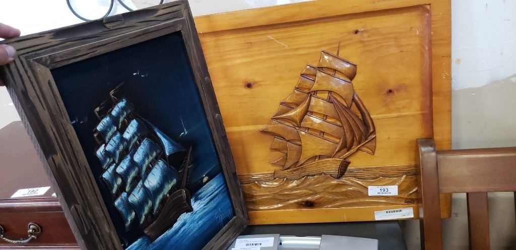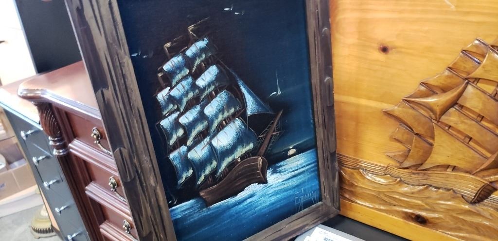 VELVET SHIP PAINTING, CARVED WOOD SHIP AND COWBOY PRINT