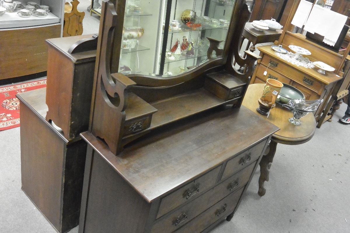 VICTORIAN ENGLISH VANITY DRESSER WITH BEVELLED SWING MIRROR