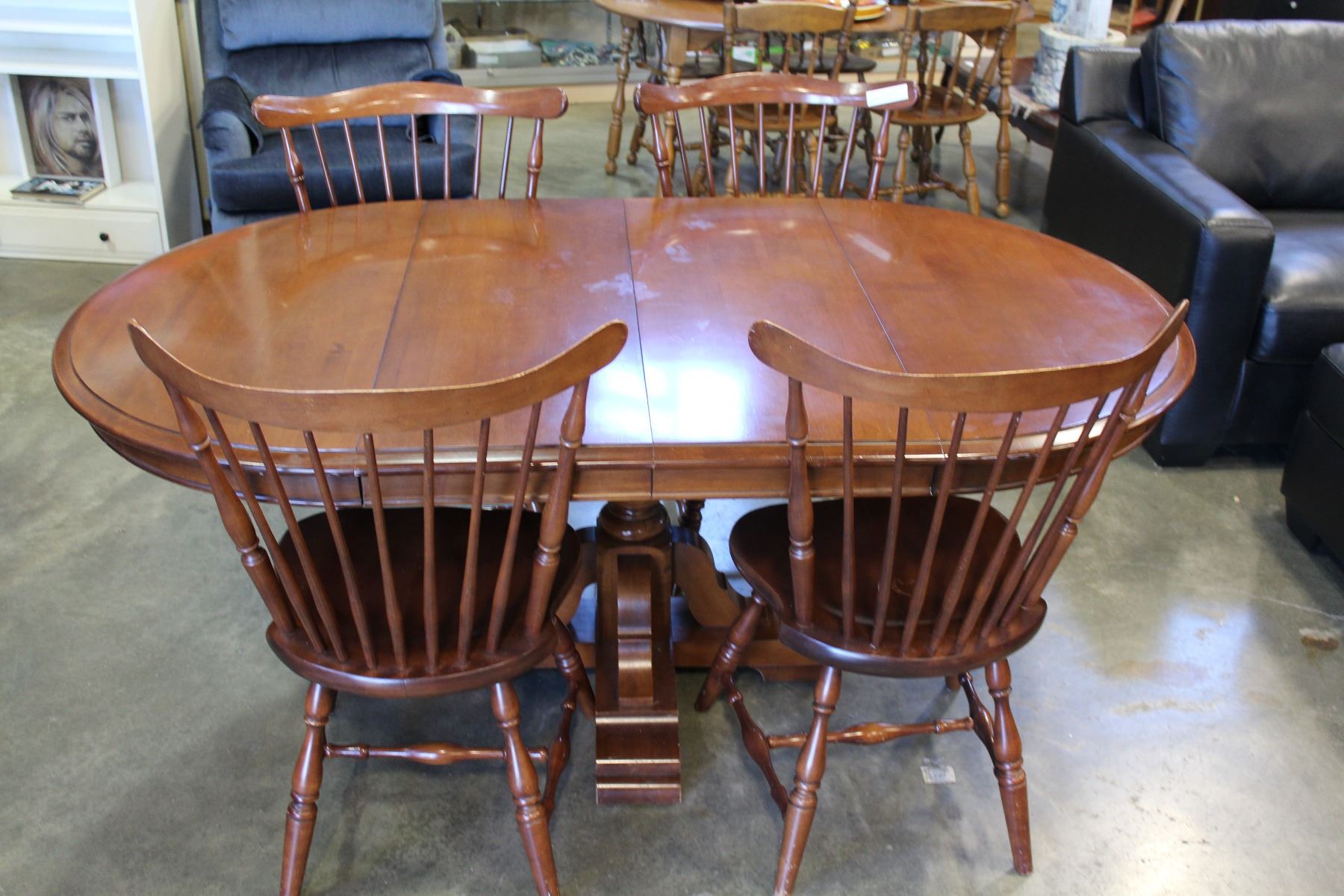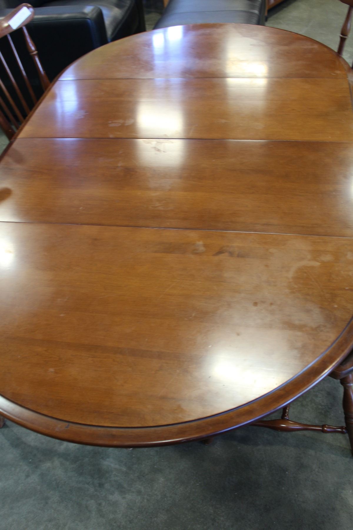 VILAS MAPLE PEDESTLE DINING TABLE WITH 2 LEAFS AND FOUR SPINDLE BACK CHAIRS