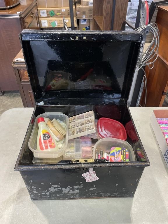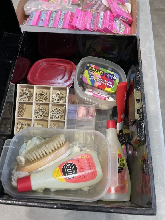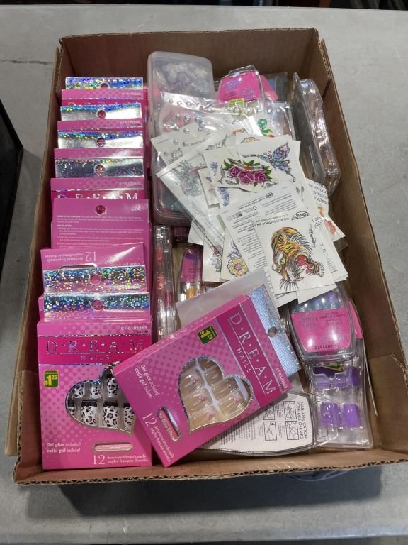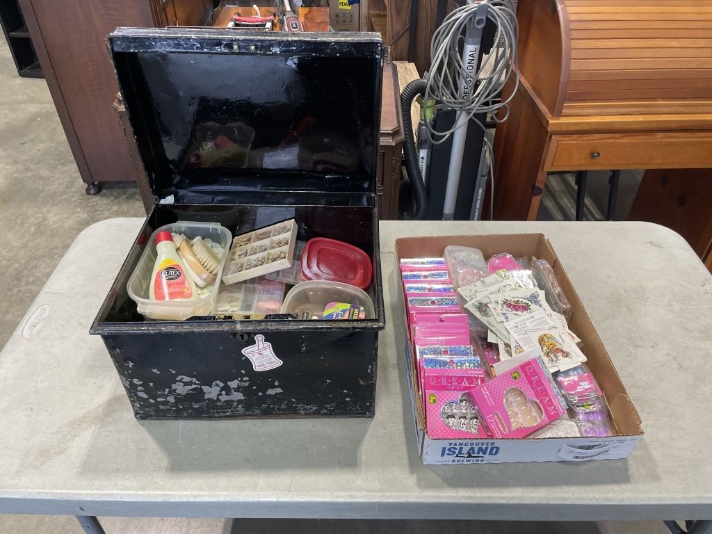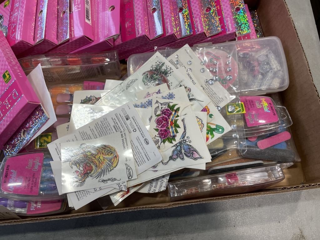 VINTAG EMETAL TRUNK FULL OF NAIL AND BEUTY IREMS, CRAFTS, AND TRAY OF FAKE TATTOOS 'ED HARDY' AND NA