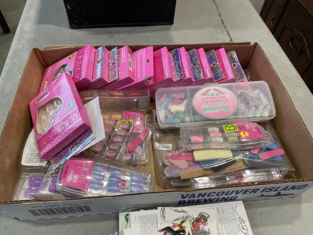 VINTAG EMETAL TRUNK FULL OF NAIL AND BEUTY IREMS, CRAFTS, AND TRAY OF FAKE TATTOOS 'ED HARDY' AND NAILS
