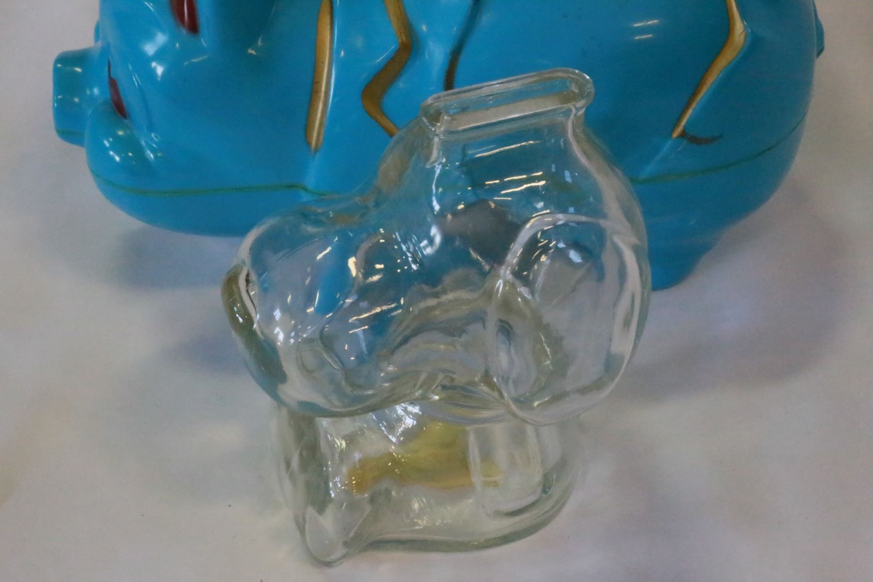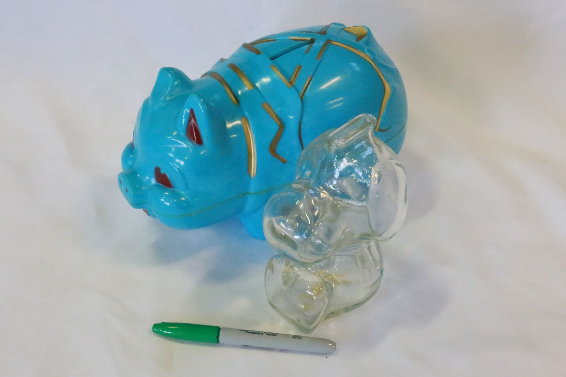 VINTAGE 6" GLASS 1958 SNOOPY PIGGY BANK AND RELIABLE PIGGY BANK