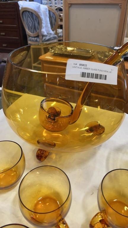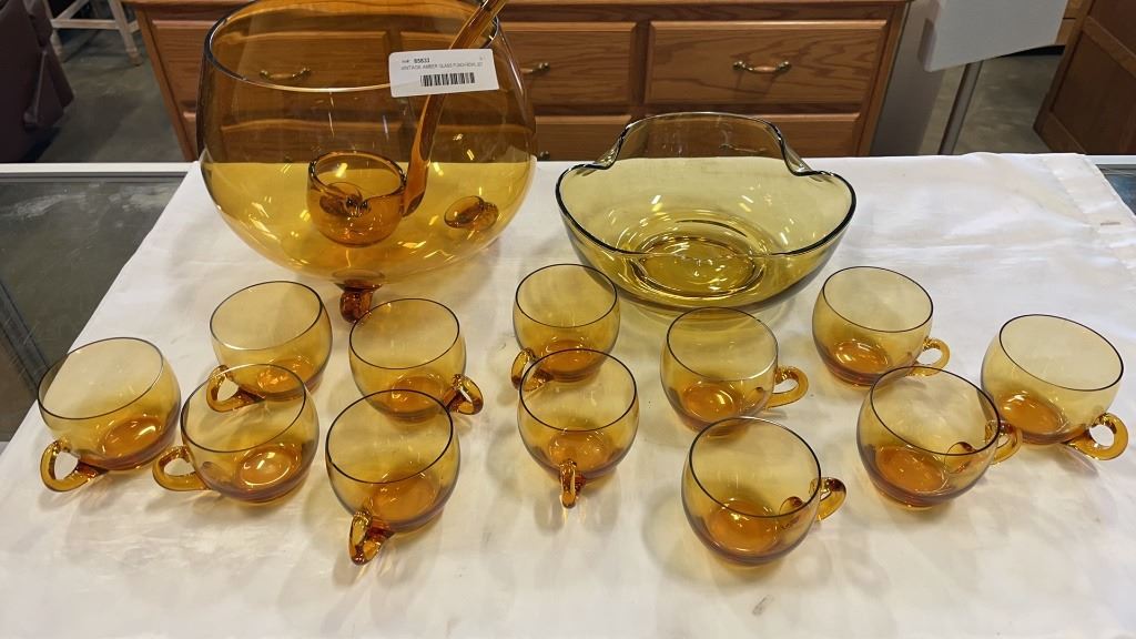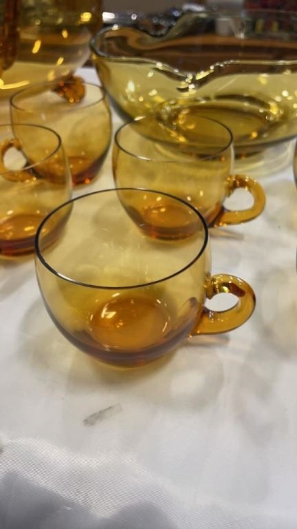 VINTAGE AMBER GLASS PUNCH BOWL SET