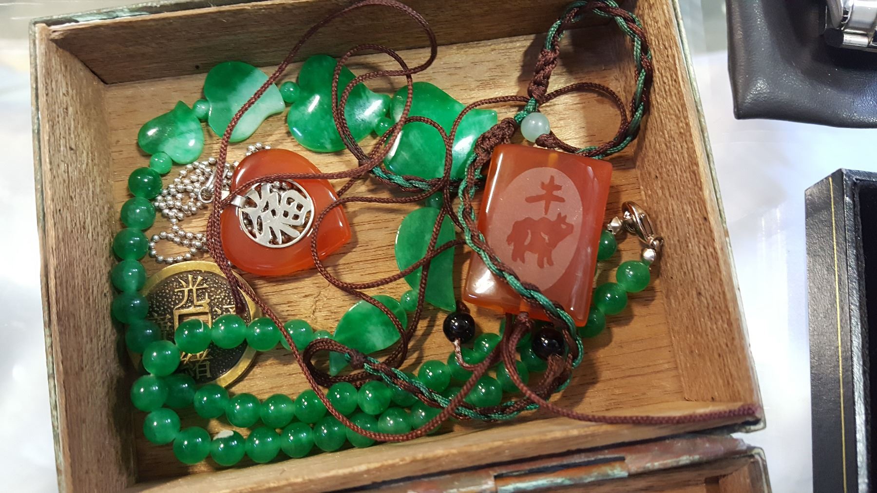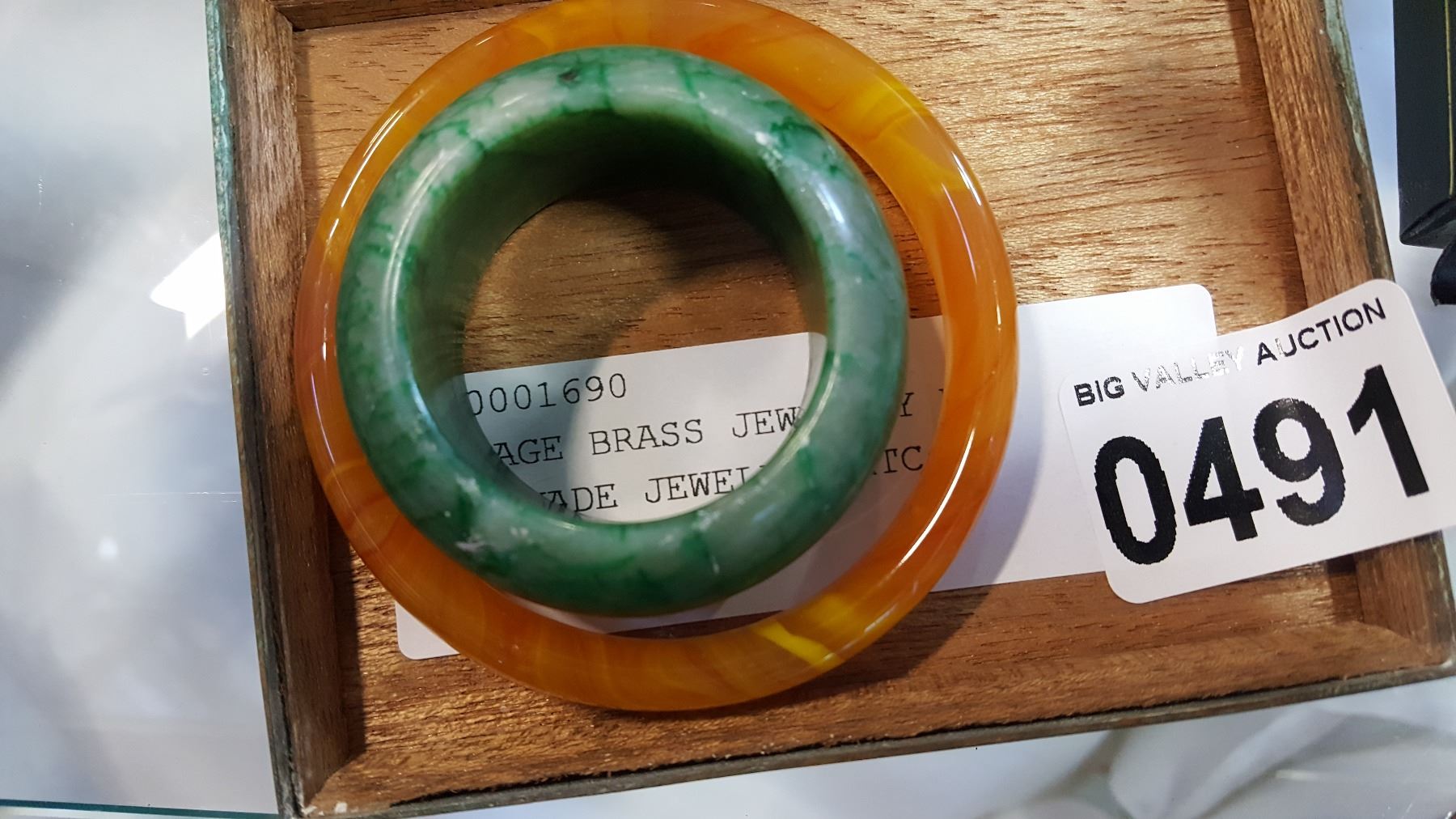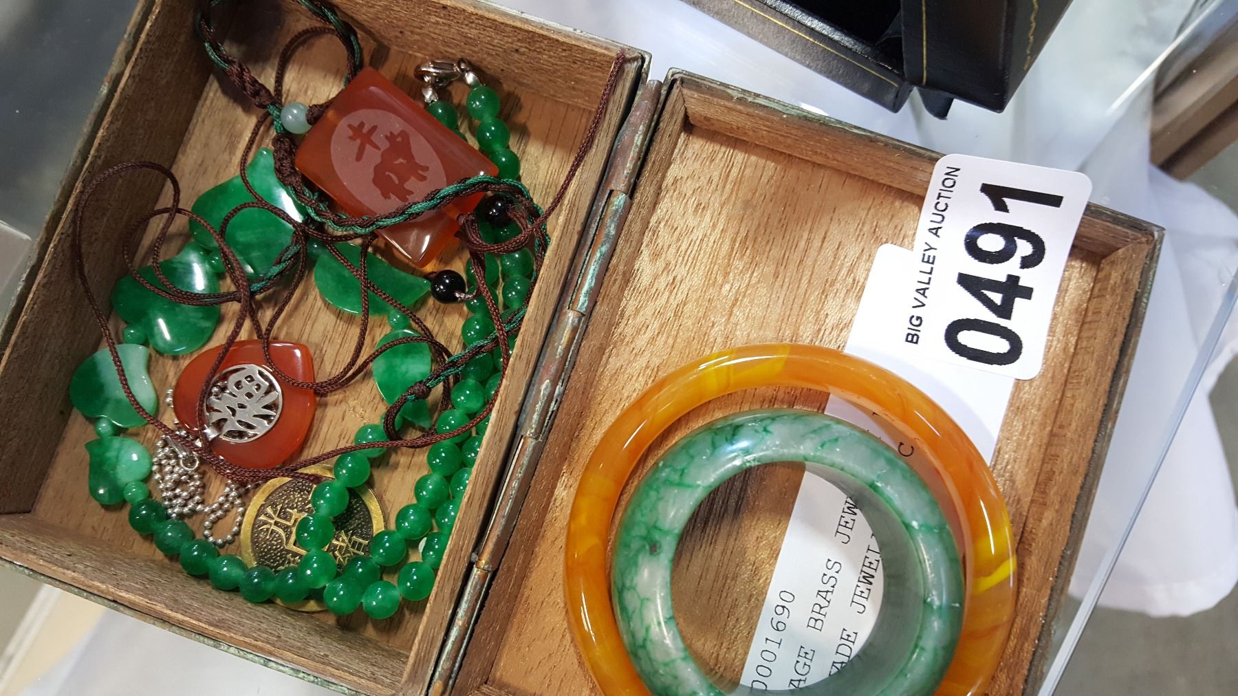 VINTAGE BRASS JEWELLRY BOX WITH JADE JEWELLRY ETC.