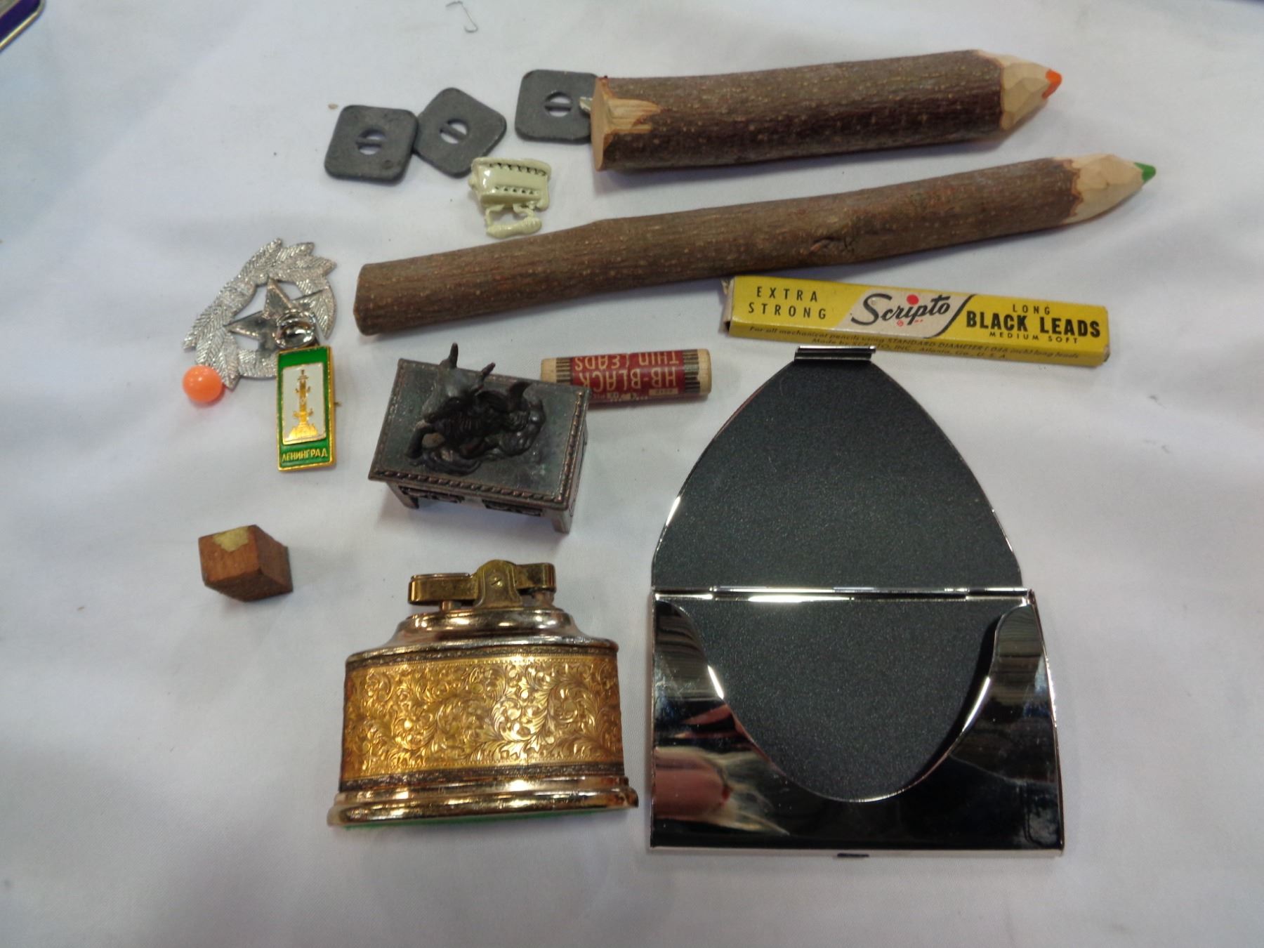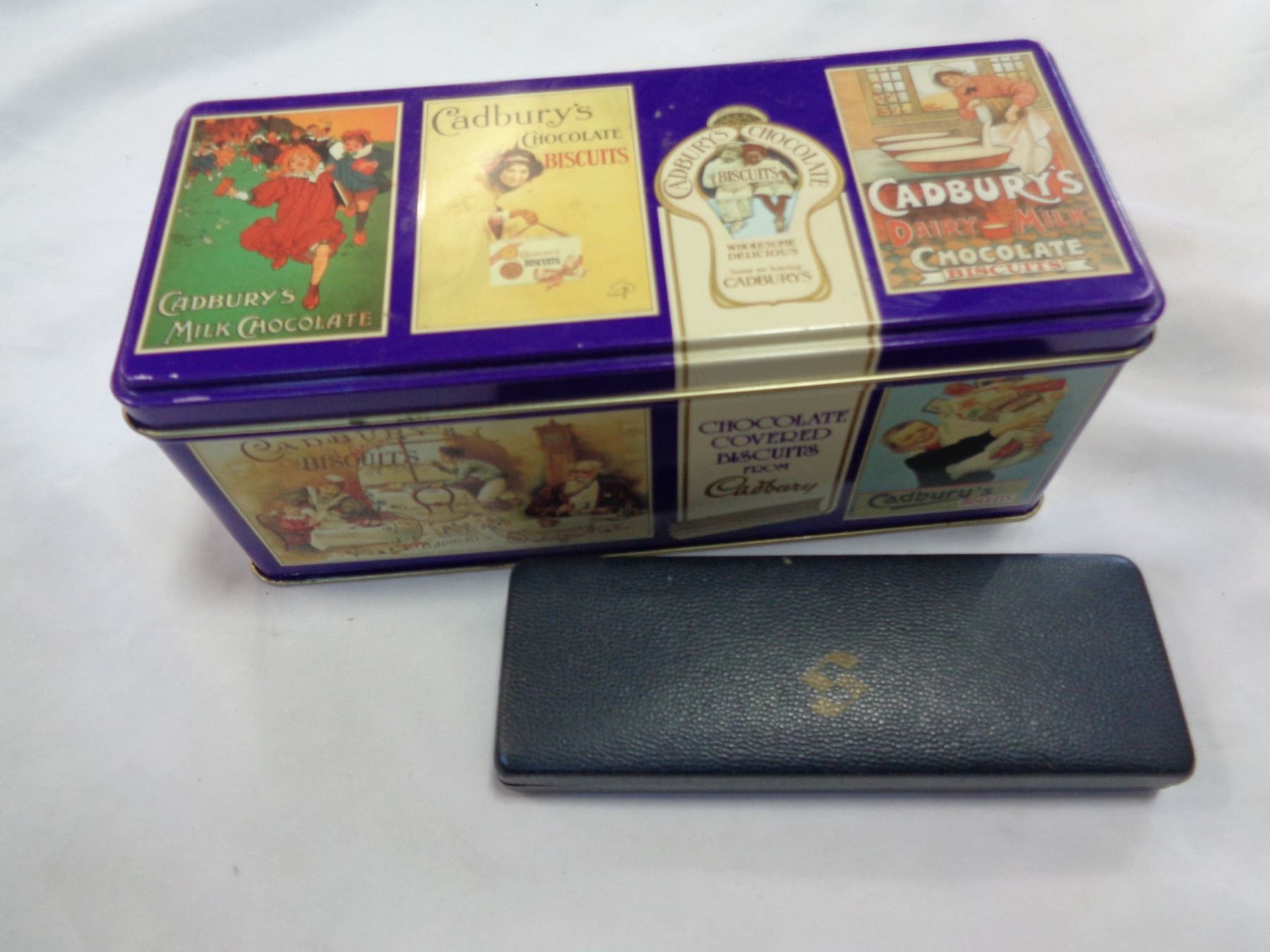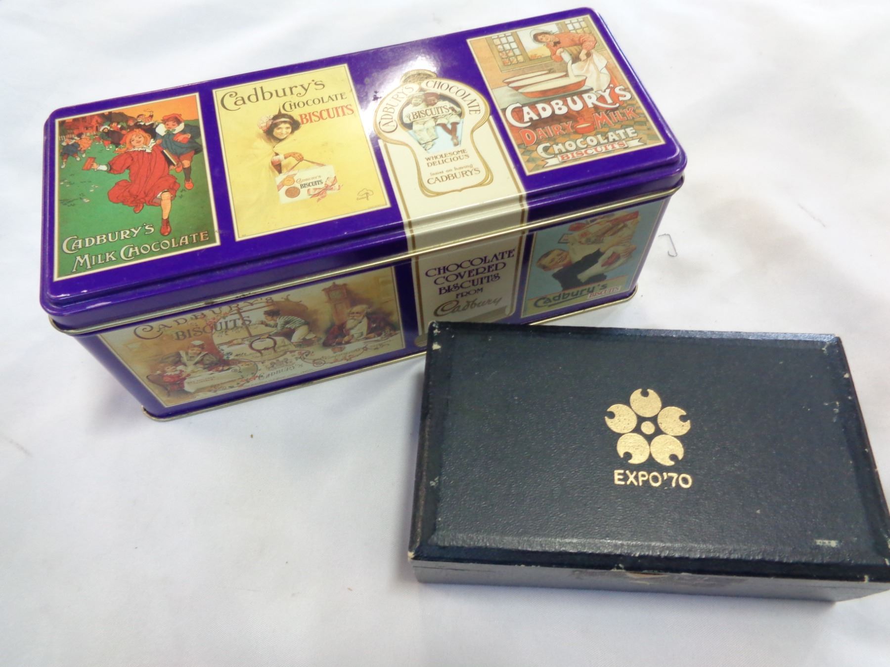 VINTAGE CADBURY TIN W/ VINTAGE COLLECTIBLES, SHEAFFER PEN, ETC, AND 24K GP EXPO 70 DISHES