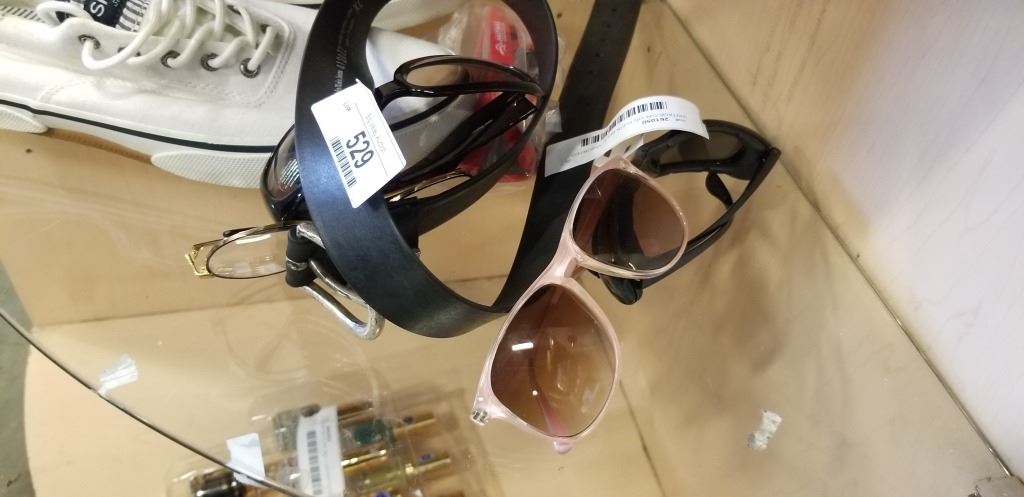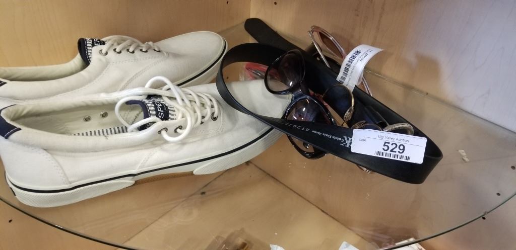 VINTAGE CALVIN KLEIN BELT, ASSORTED SUNGLASSES INCLUDING HARLEY DAVIDSON AND SPERRY SIZE 13 SHOES