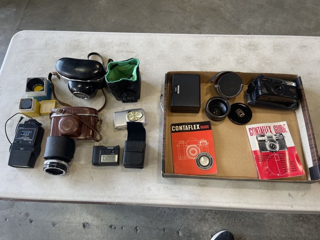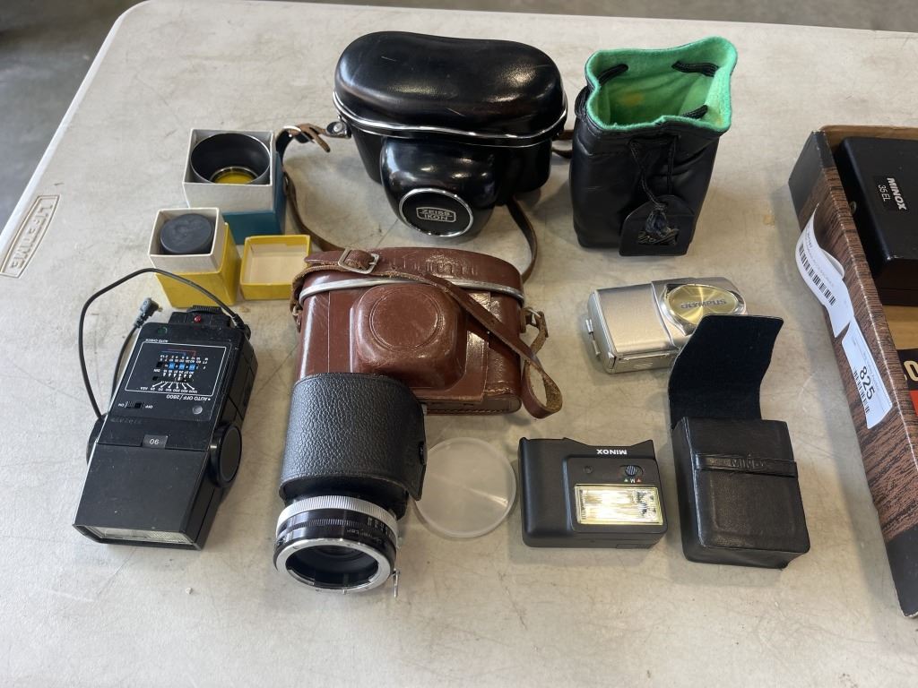 VINTAGE CAMERA ACCESSORIES INCLUDING LEATHER CASES, FLASHES, LENSES ETC