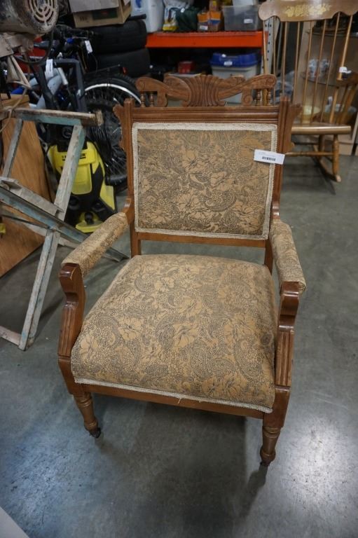 VINTAGE CARVED WOOD FRAMED ARMCHAIR