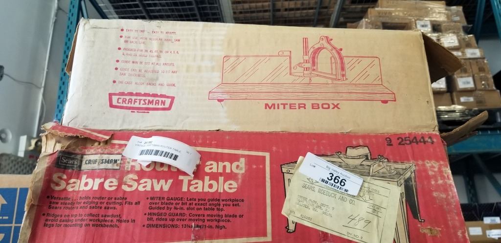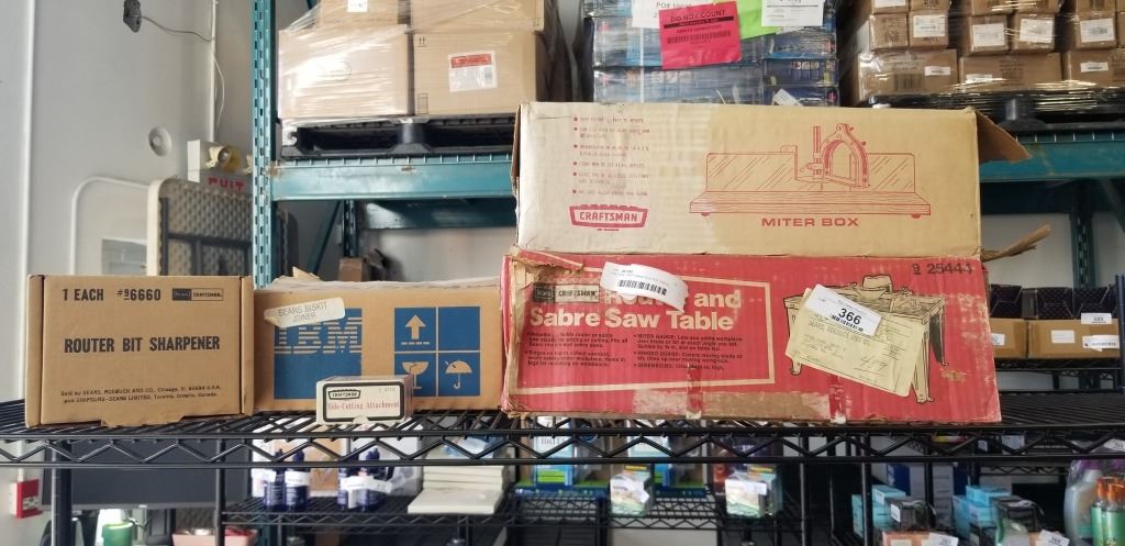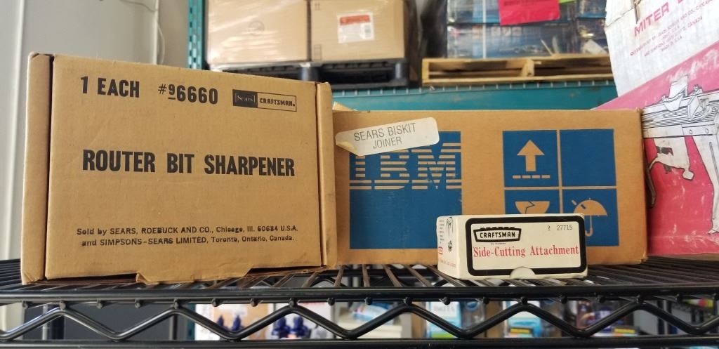 VINTAGE CRAFTSMAN ROUTER TABLE, MITER BOX, BIT SHARPENER, SIDE CUTTER ATTACHMENT AND BISKIT SYSTEM ATTACHMENT, MOST IN ORIGINAL PACKAGING
