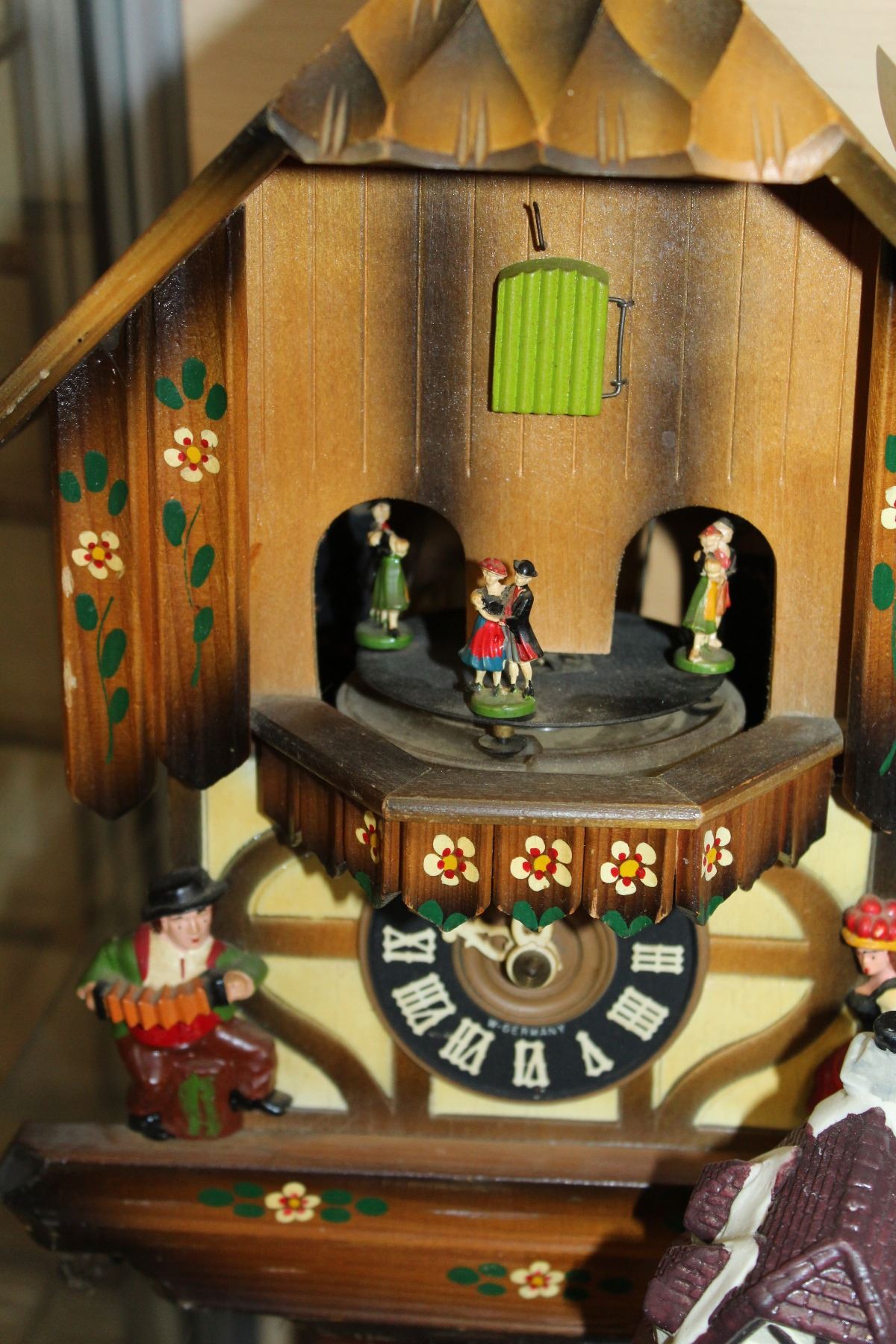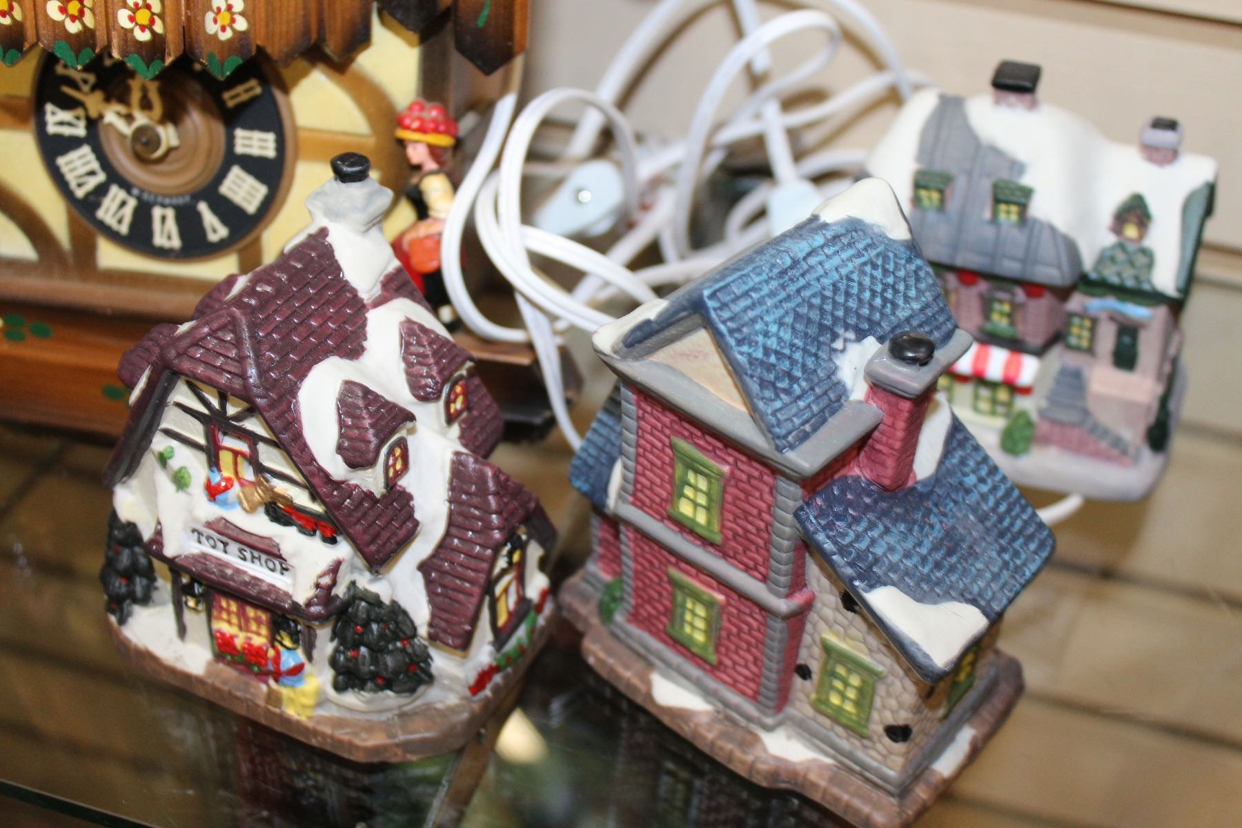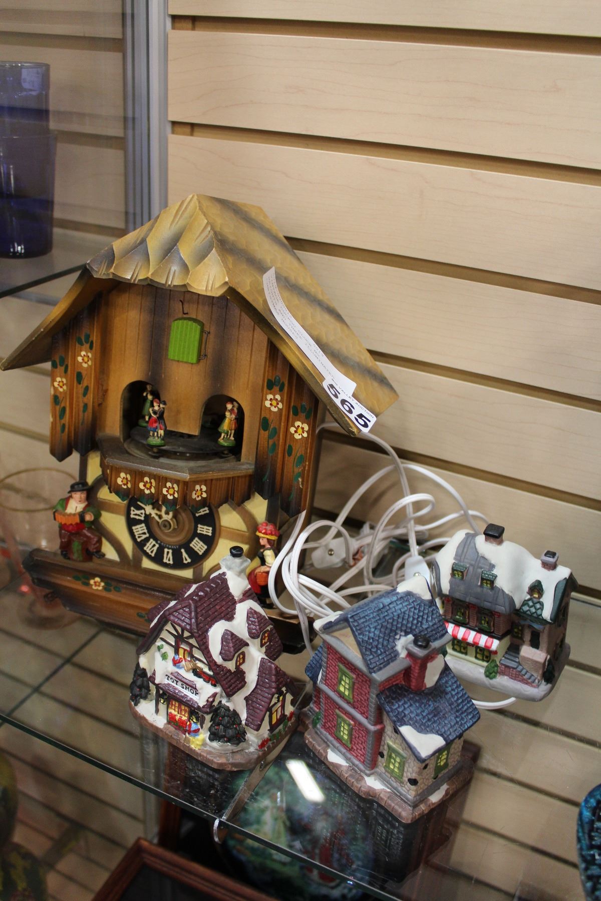 VINTAGE CUCKOO CLOCK NO WEIGHTS AND THREE ILLUMINATED CHRISTMAS HOUSES
