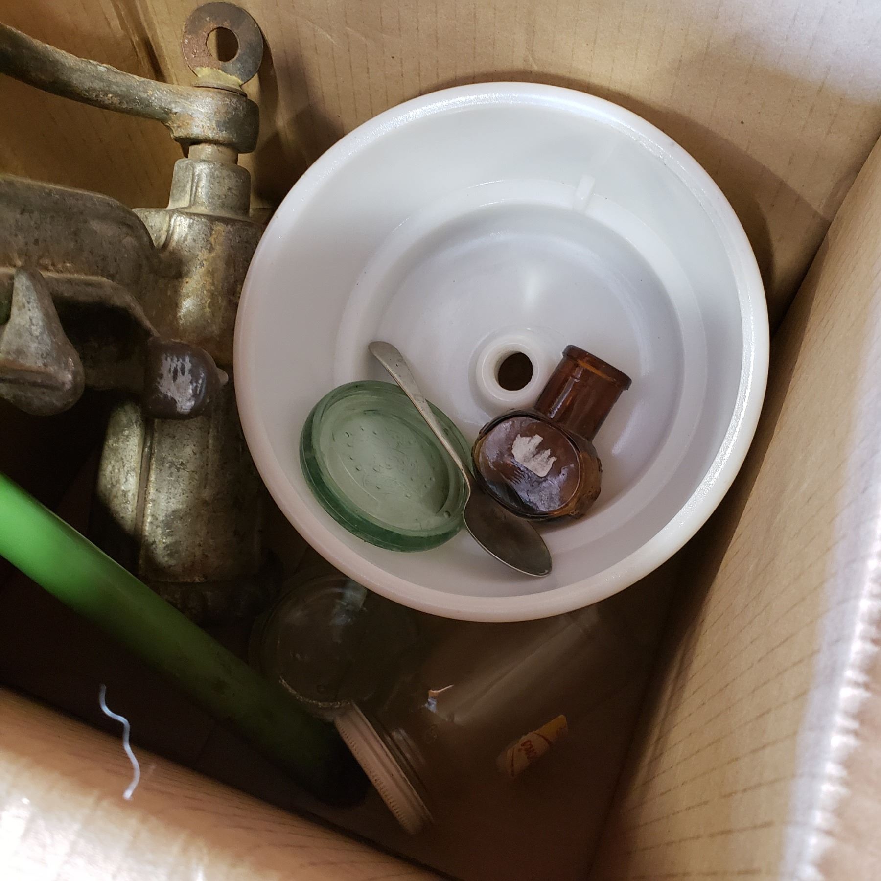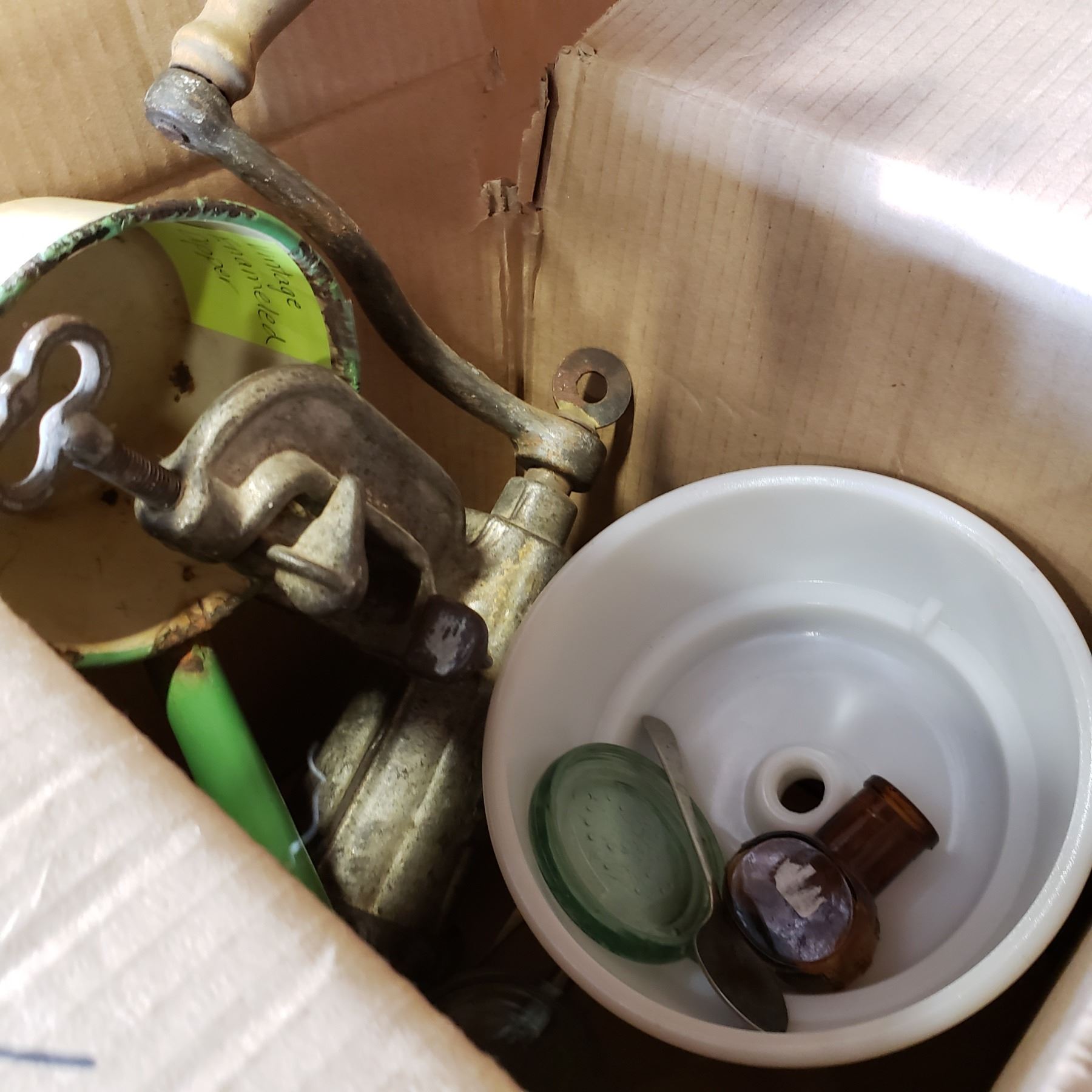 VINTAGE ENAMEL DIPPER, DENTAL SPITOON, MEAT GRINDER, OLD BOTTLES, SPOON
