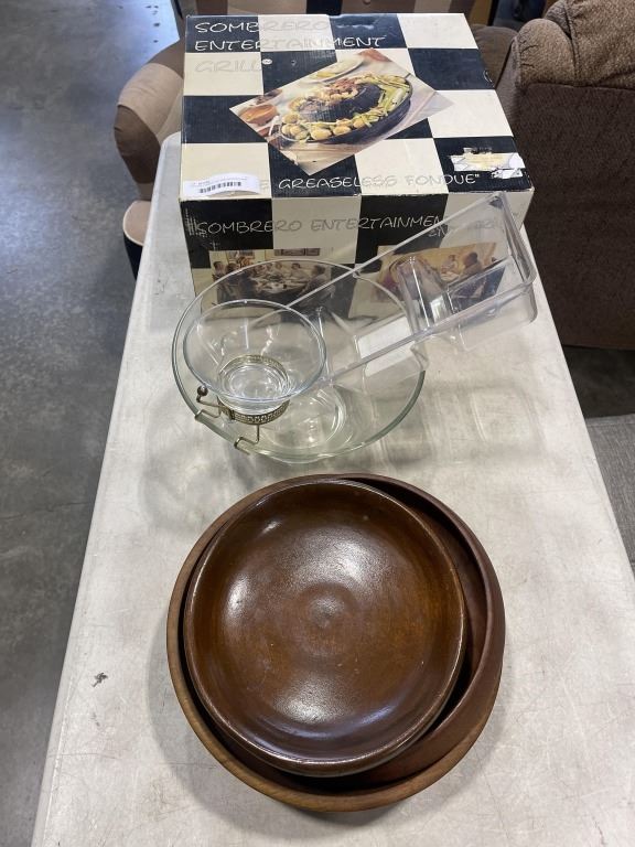 VINTAGE FONDUE SET AND WOODEN AND GLASS SERVING BOWLS
