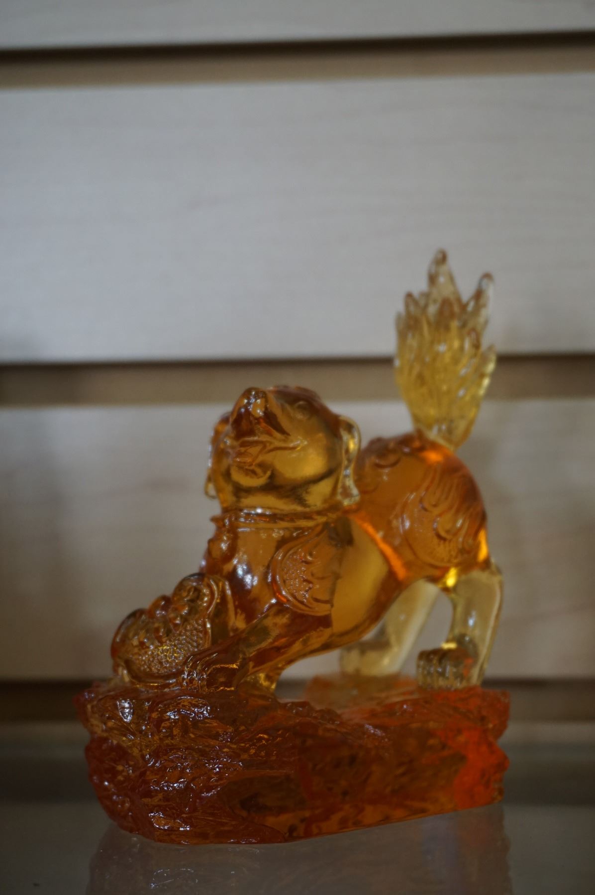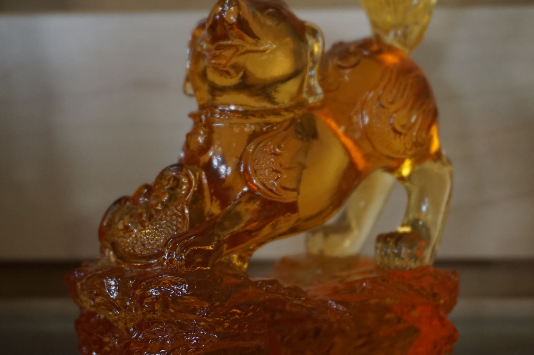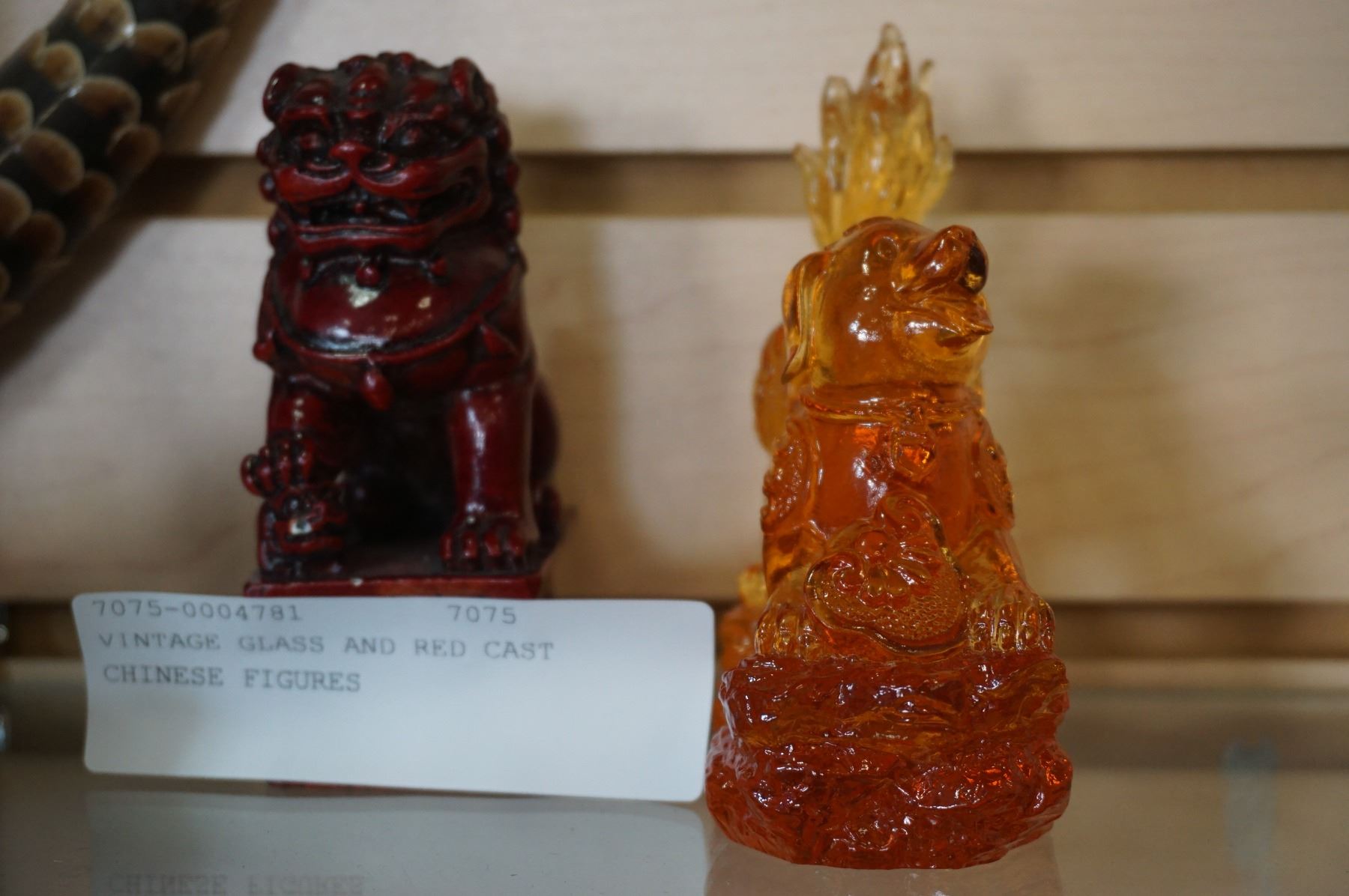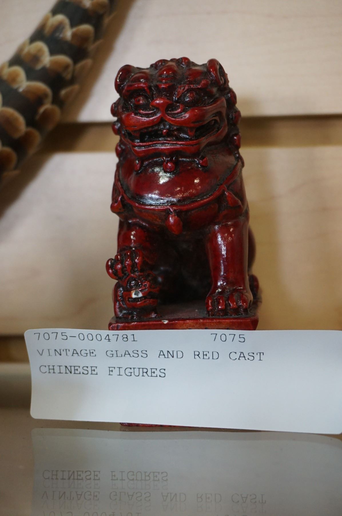 VINTAGE GLASS AND RED CAST CHINESE FIGURES