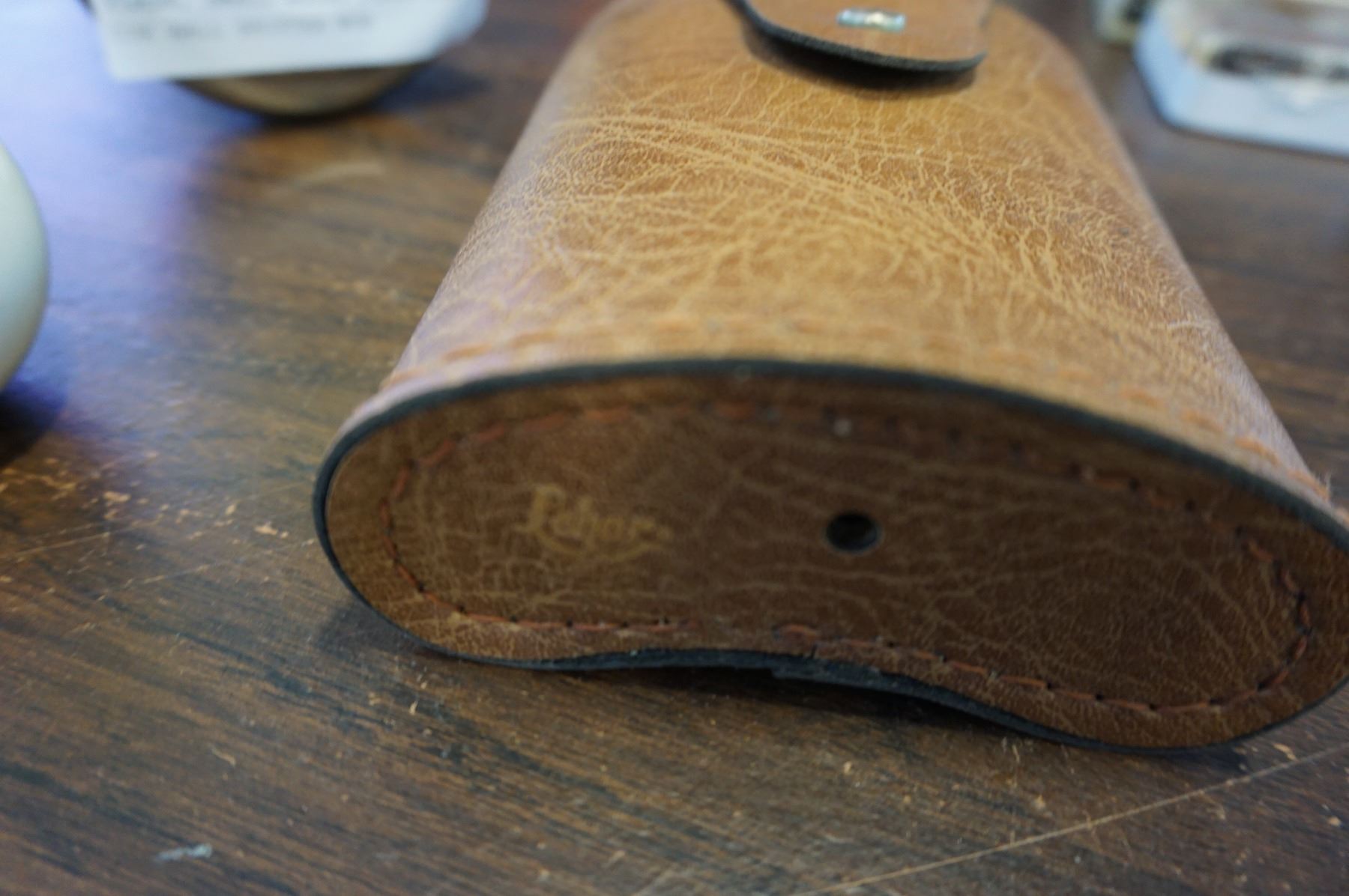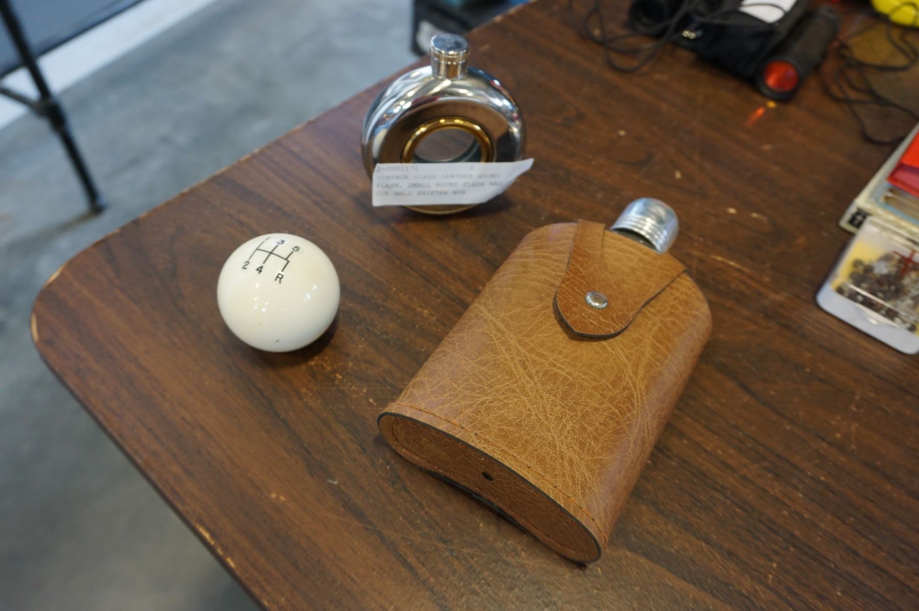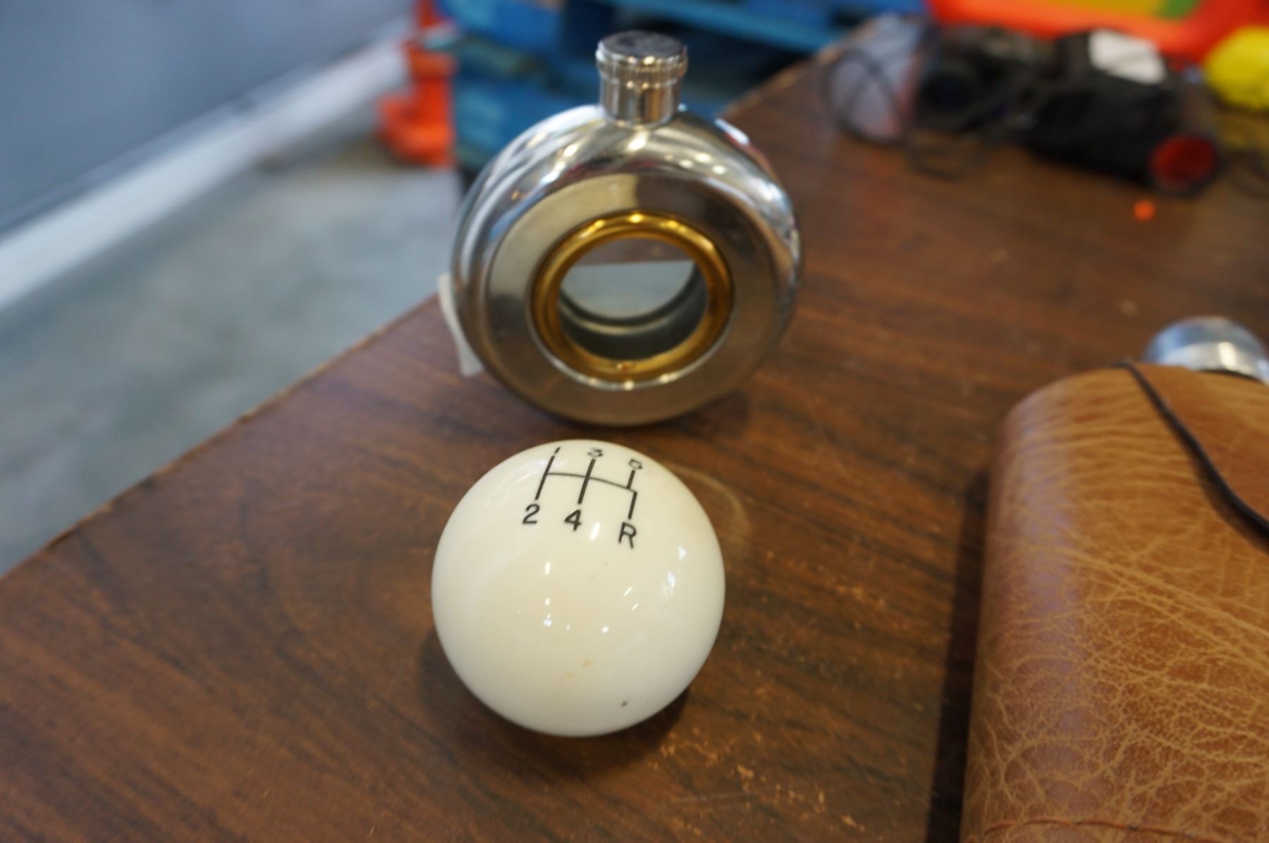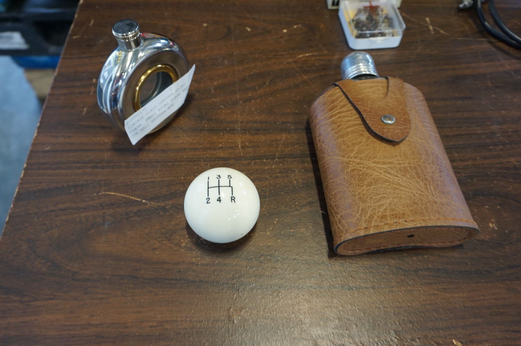 VINTAGE GLASS LEATHER BOUND FLASK, SMALL ROUND FLASK AND CUE BALL SHIFTER NOB