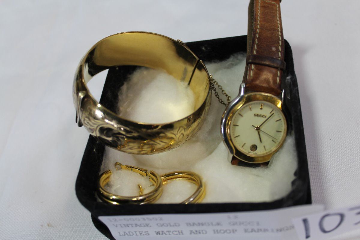 VINTAGE GOLD BANGLE GUCCI LADIES WATCH AND HOOP EARRINGS