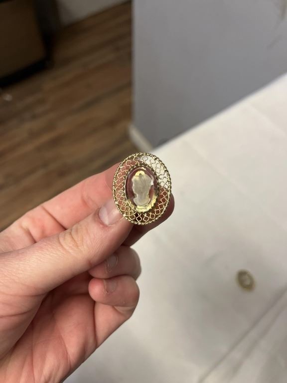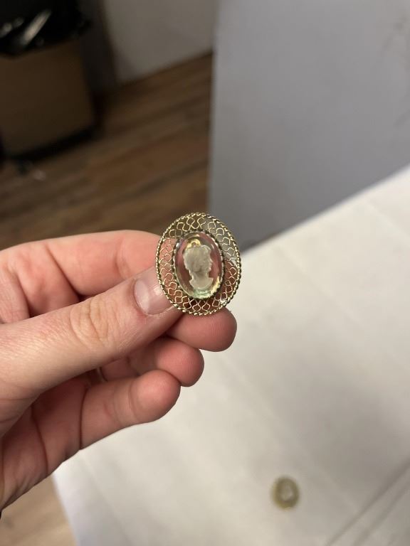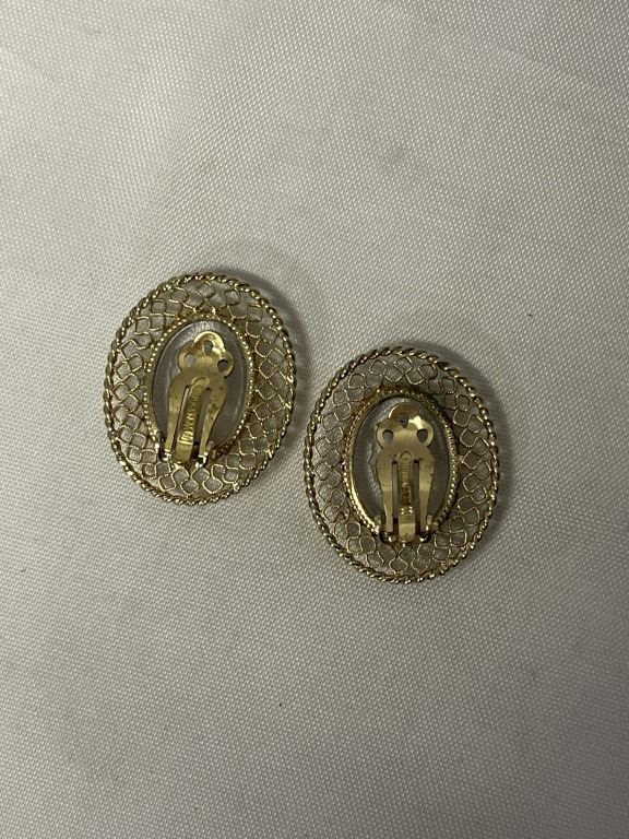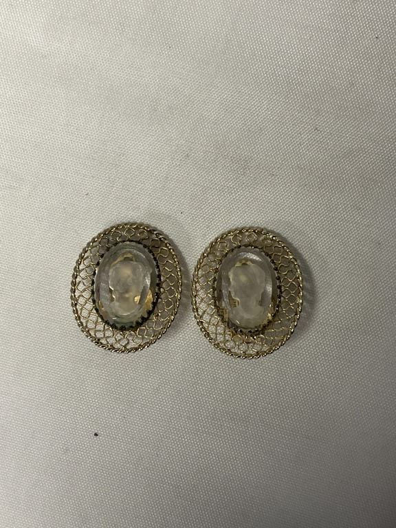 VINTAGE GOLD TONE W/ REVERSED CARVED GLASS STONE CAMEO DESIGN CLIP ON EARRINGS EACH MARKED WHITNIGS AND DAVIS CO