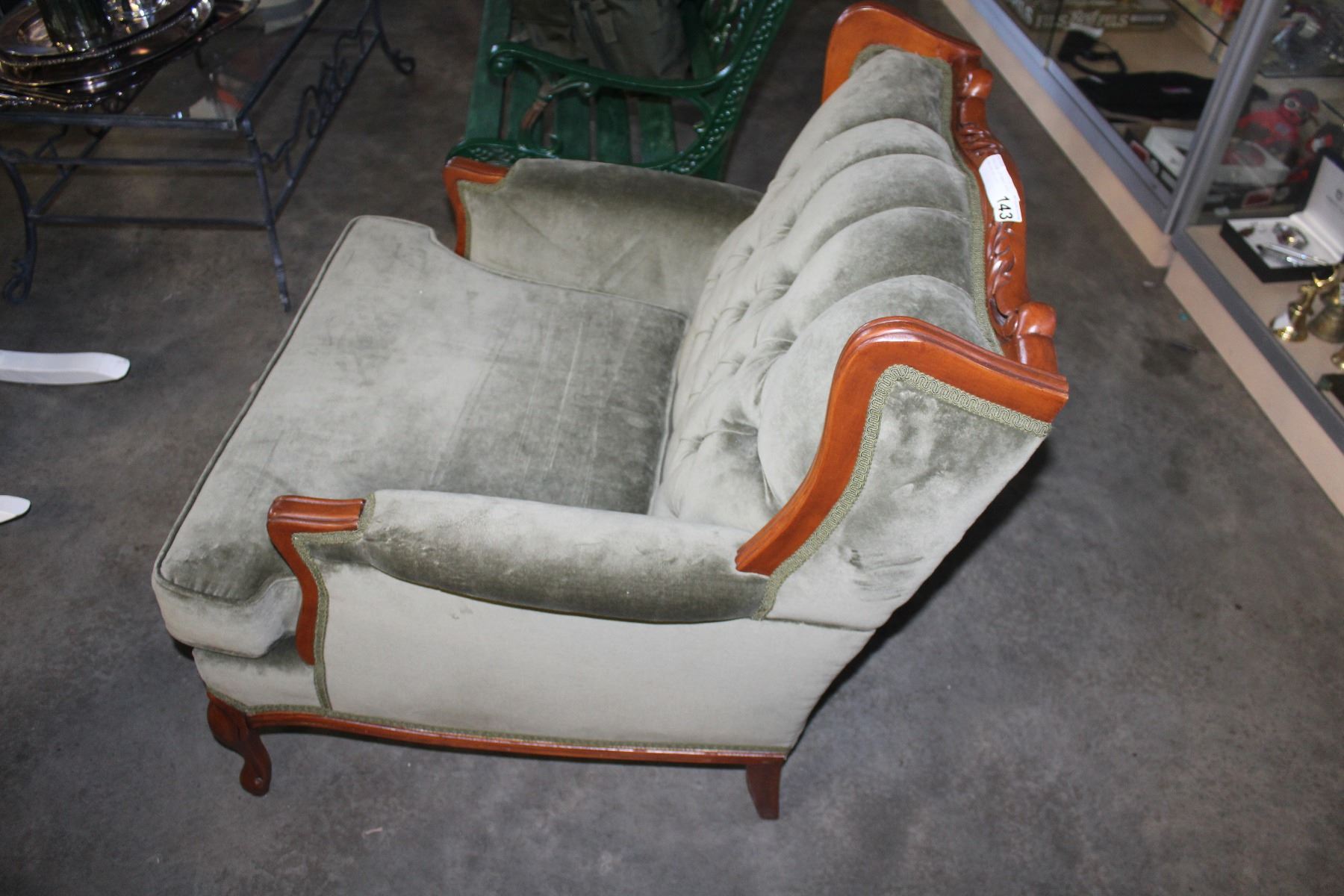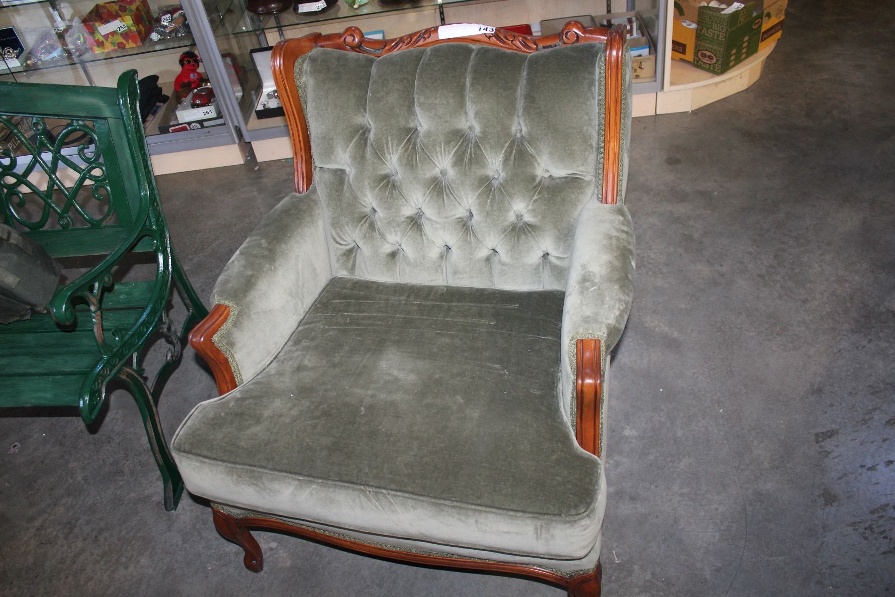 VINTAGE GREEN BUTTONBACK WOOD FRAMED WING BACK CHAIR