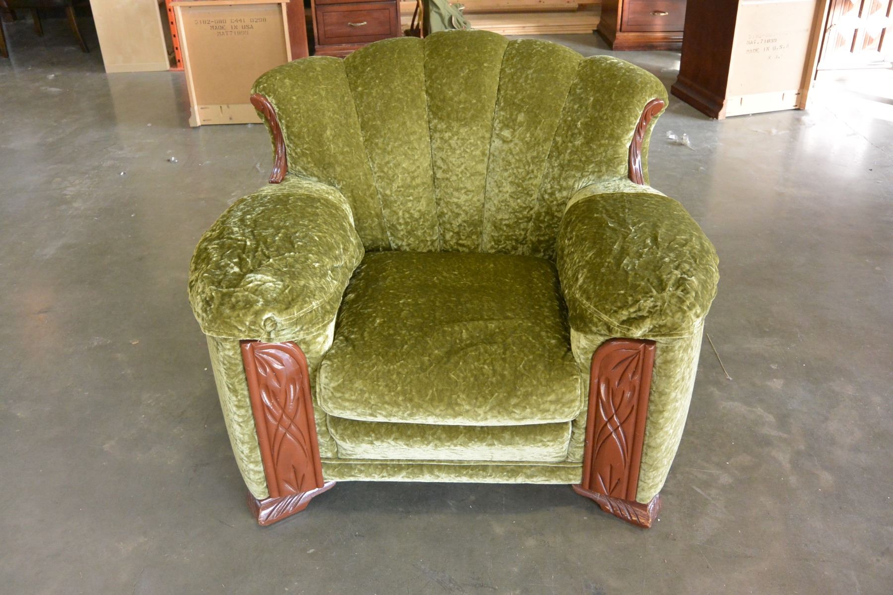 VINTAGE GREEN UPOLSTERED CHANNEL BACK CRUSHED VELVET ARMCHAIR