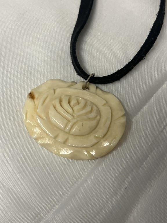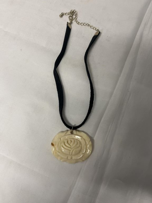 VINTAGE HAND CARVED BONE ROSE PENDANT W/ BLACK VELVET CORD NECKLACE