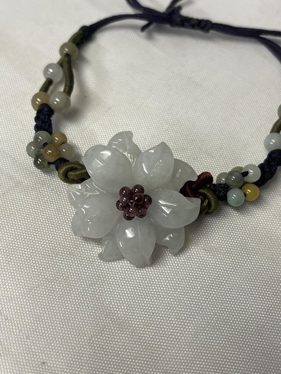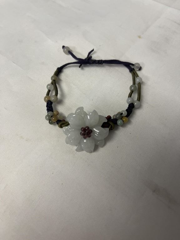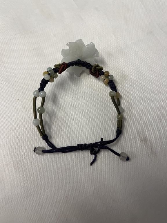VINTAGE HAND CARVED JADE W/ TINY GARNET BEADS FLOWER CENTER W/ BEADS BRACELET, SELF ADJUSTABLE