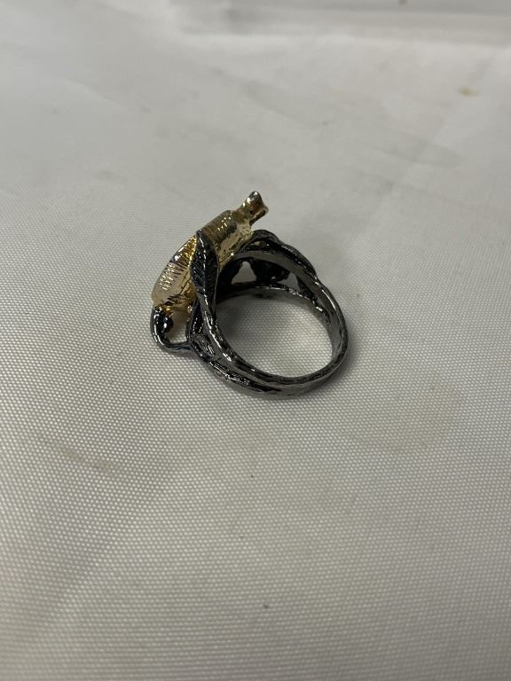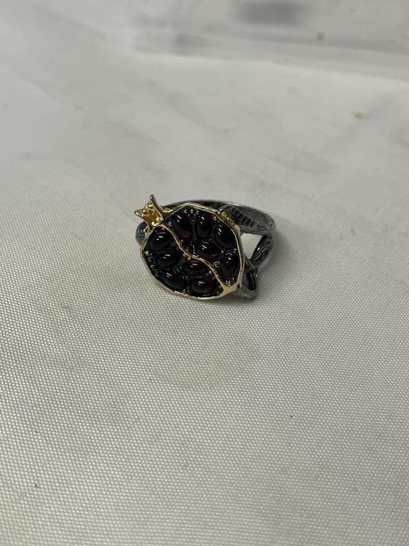VINTAGE HAND CRAFTED SILVER AND GOLD COLOUR W/ DARK RED STONES RING, SIZE 9.5