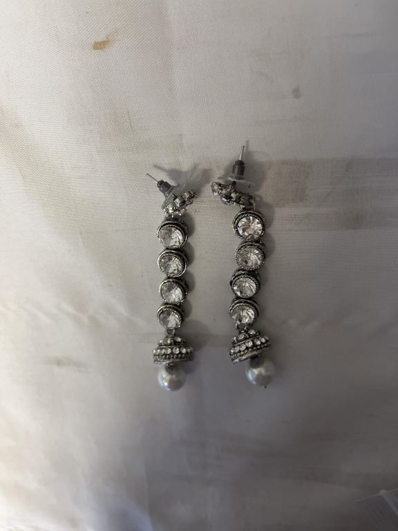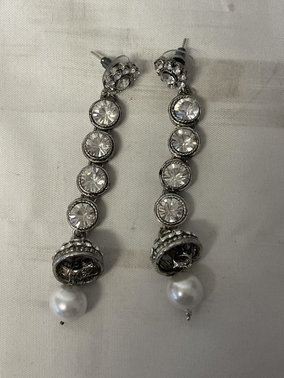 VINTAGE HEAVY SILVER TONE RHINESTONES PAIR OF DANGLE EARRINGS, EACH 3" LENGTH