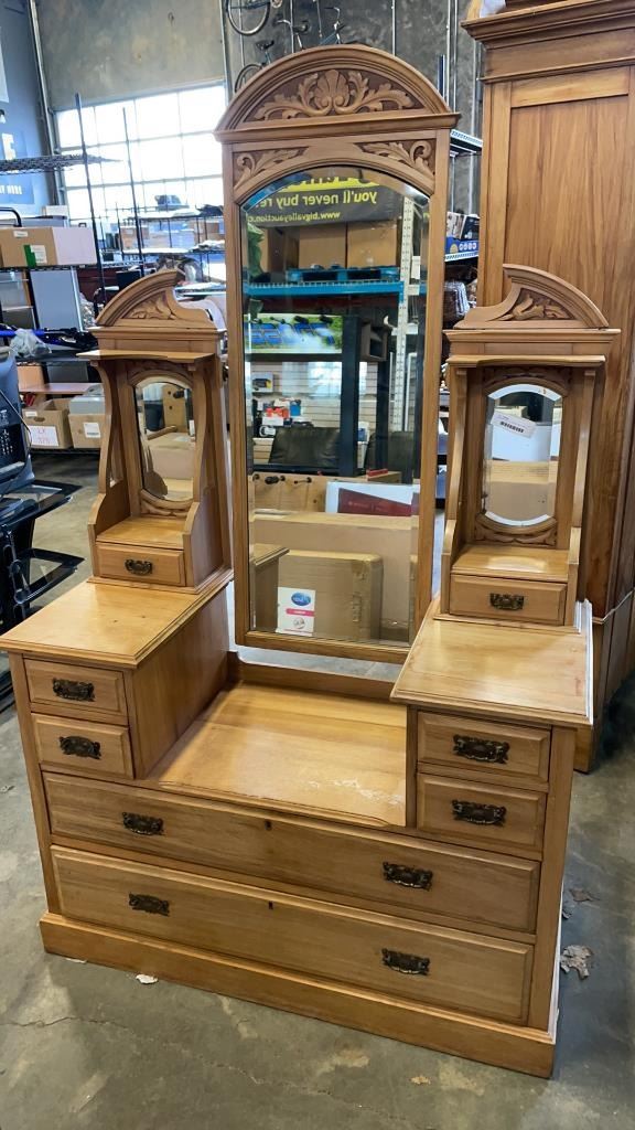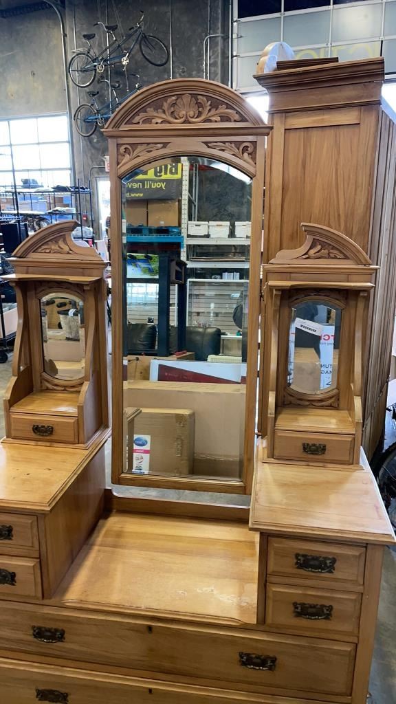 VINTAGE HIGHLY CARVED VANITY DESK WITH BEVELLED MIRROR