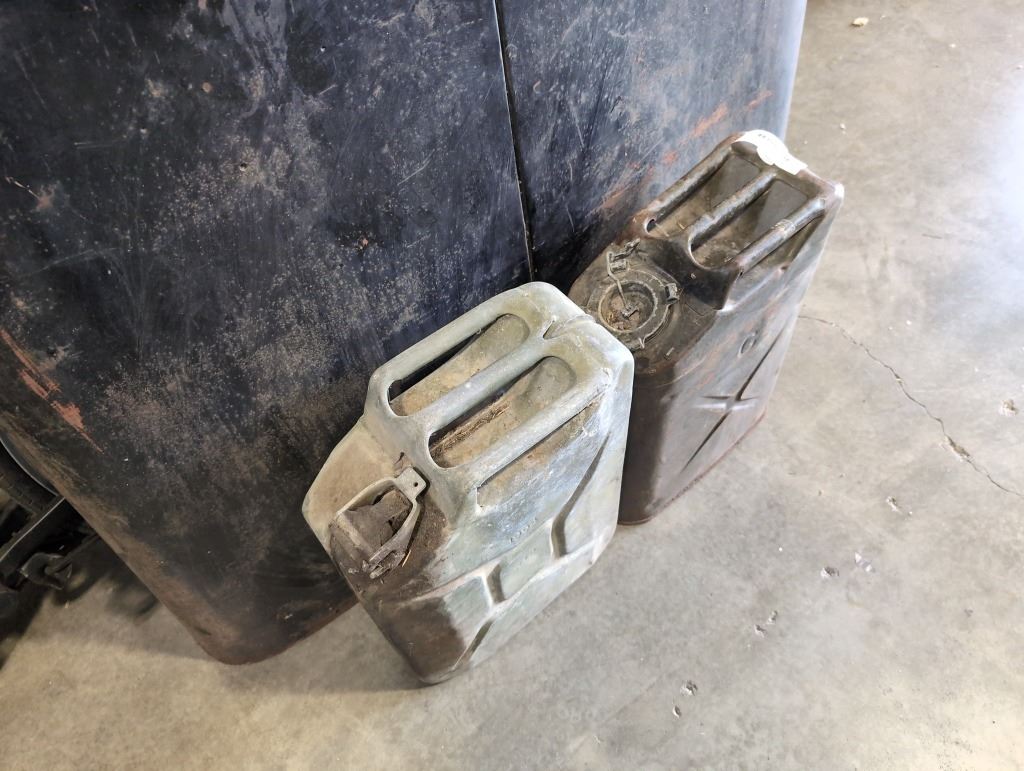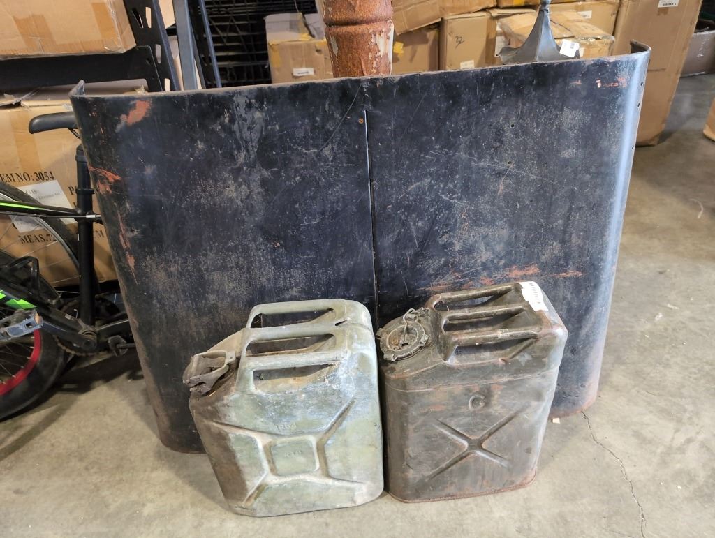 VINTAGE JEEP WILLYS HOOD AND 2 GAS CANS