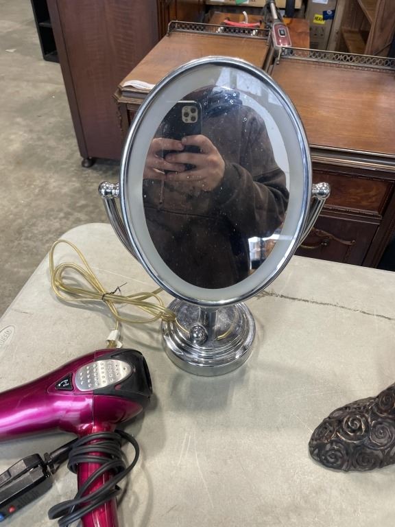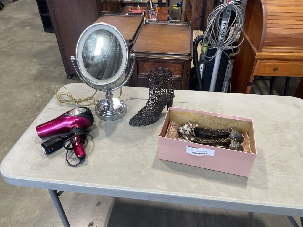 VINTAGE LADIES RHINESTONE DRESS SHOES, AND VANITY MIRRO, BLOW DRYERS, HIGH HEEL HOLDER