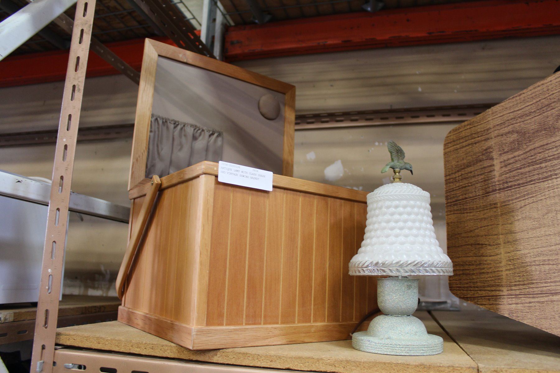 VINTAGE LAMP WITH GLASS SHADE AND VINTAGE SEWING BASKET