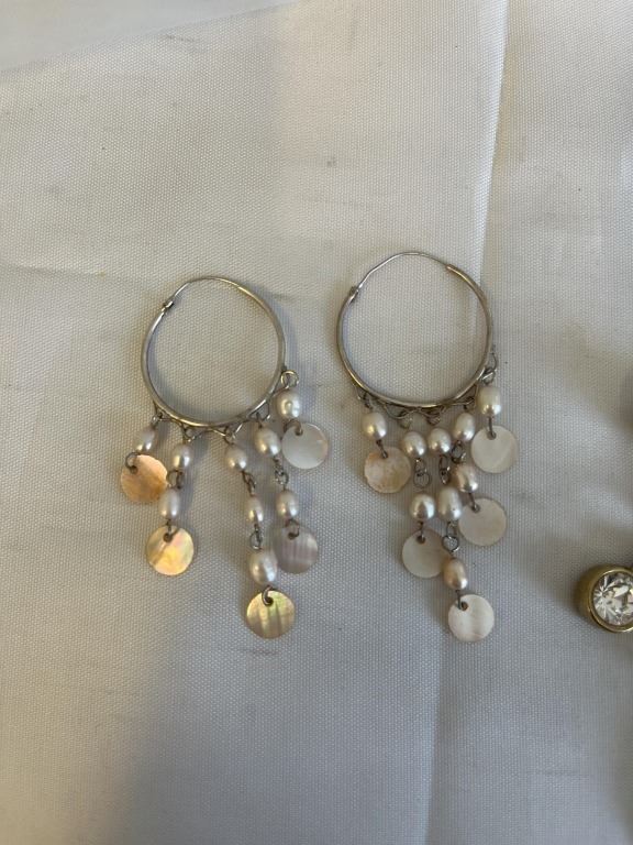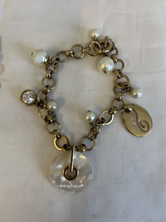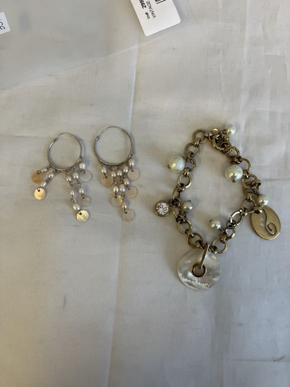 VINTAGE LINKS BRACELET W/ CHARMS AND PAIR OF STERLING SILVER W/ PEARLS DANGLE EARRINGS