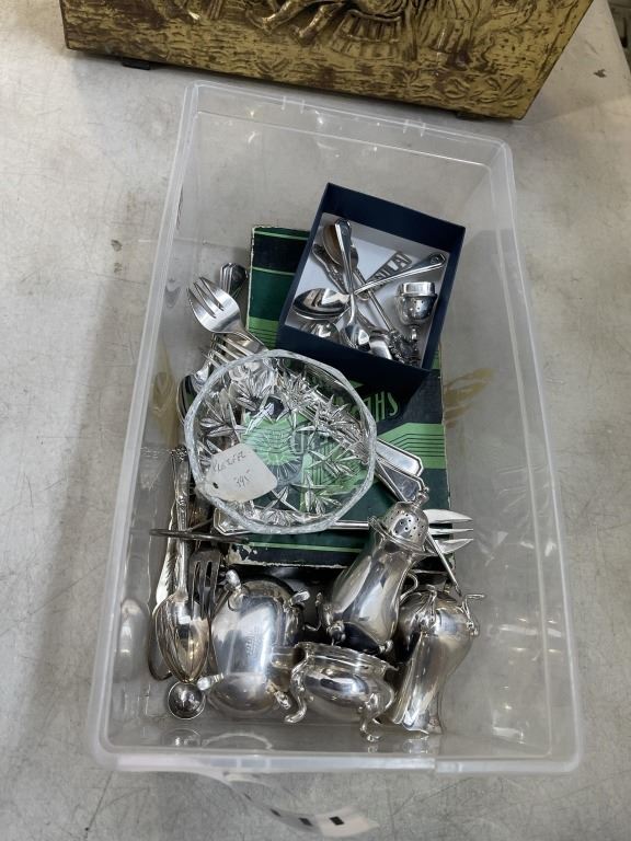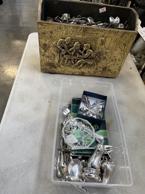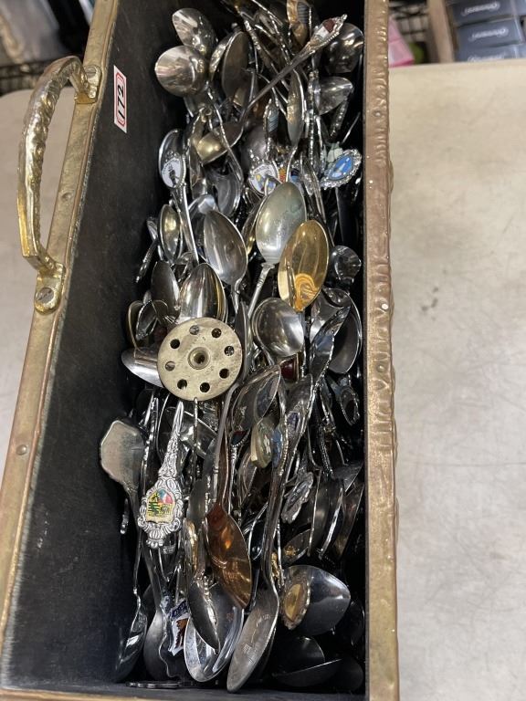 VINTAGE MAGAZINE BOX FULL OF COLLECTOR SPOONS, AND SILVER PLATED CUTLERY