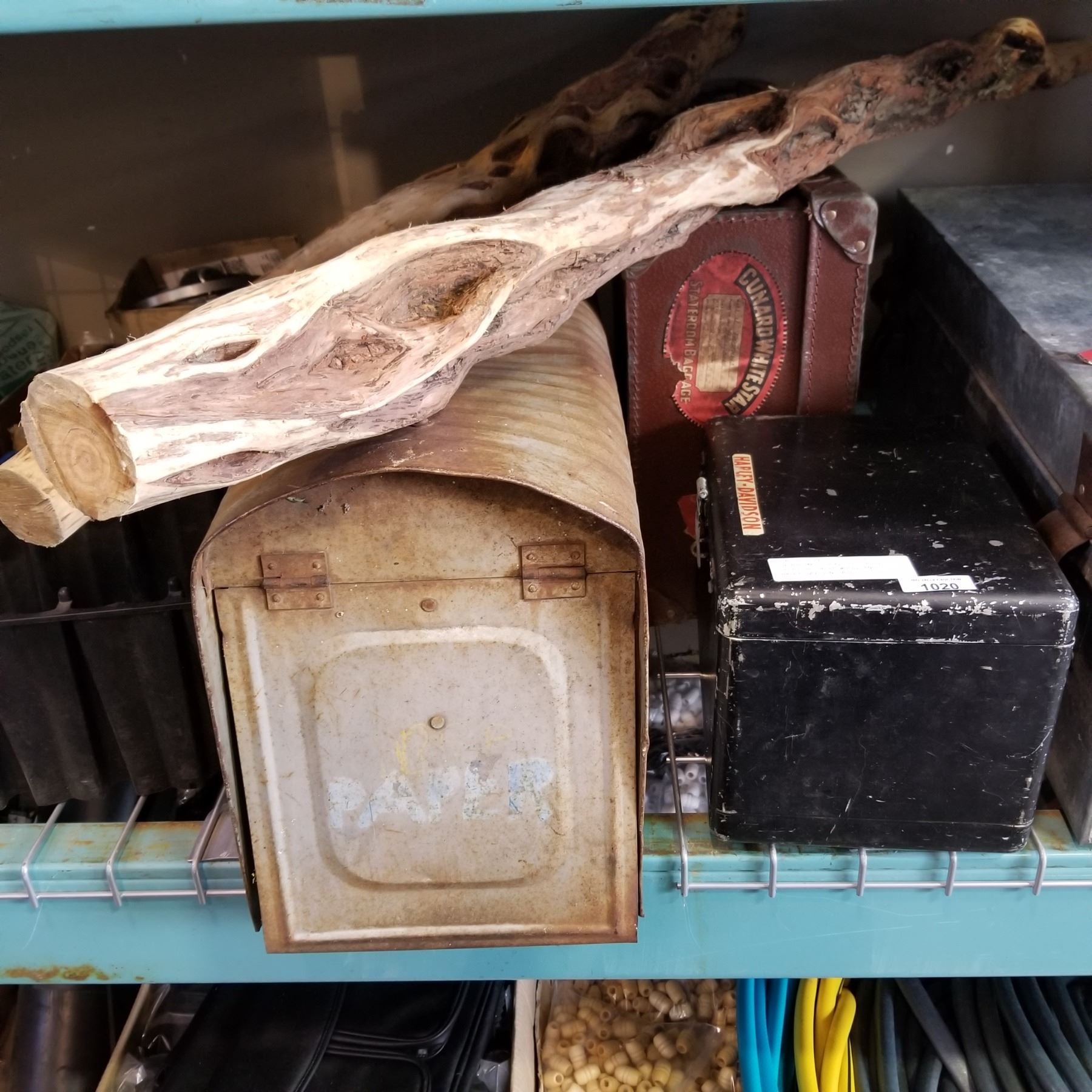 VINTAGE MAIL BOX, SUITCASE, 2 PIECES OF DRIFT WOOD, AND HARLEY DAVISON CASE