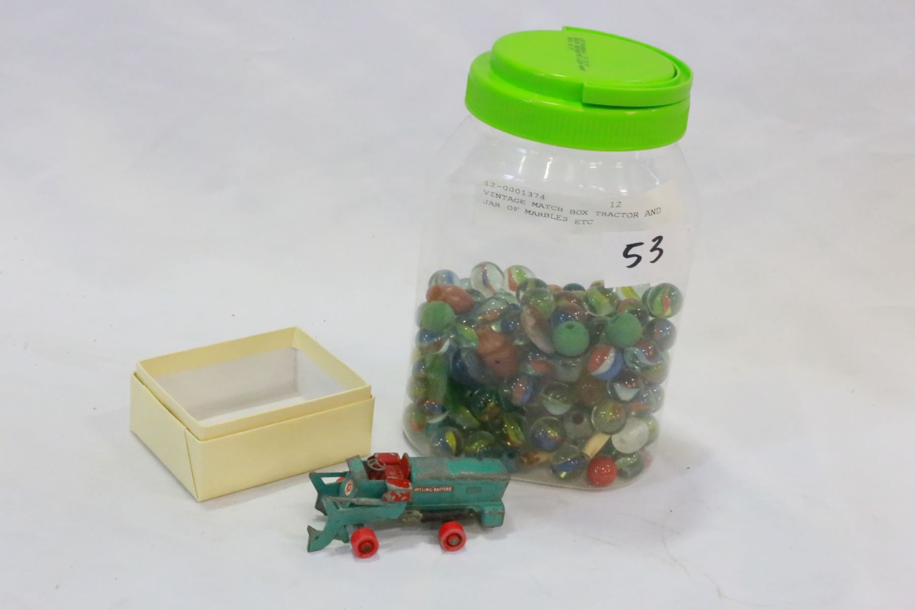 VINTAGE MATCH BOX TRACTOR AND JAR OF MARBLES ETC