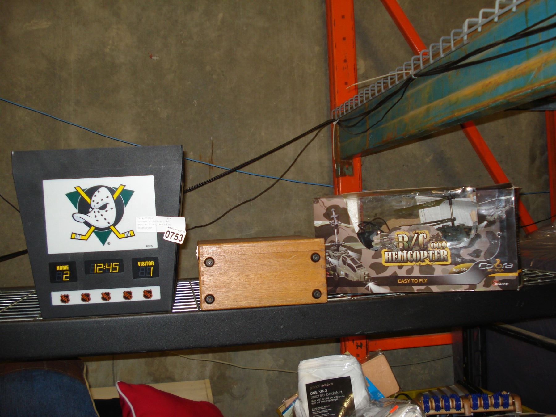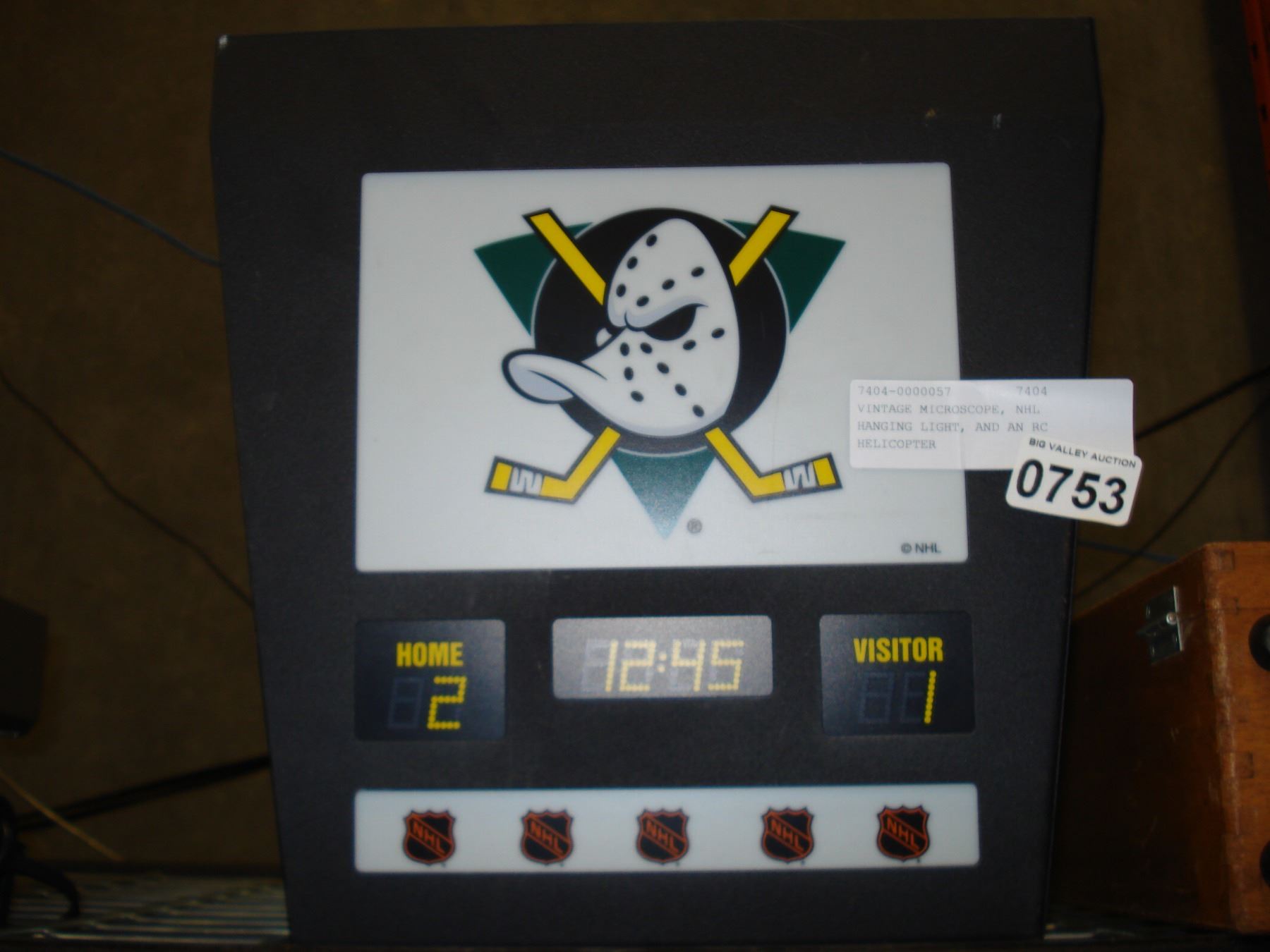 VINTAGE MICROSCOPE, NHL HANGING LIGHT, AND AN RC HELICOPTER