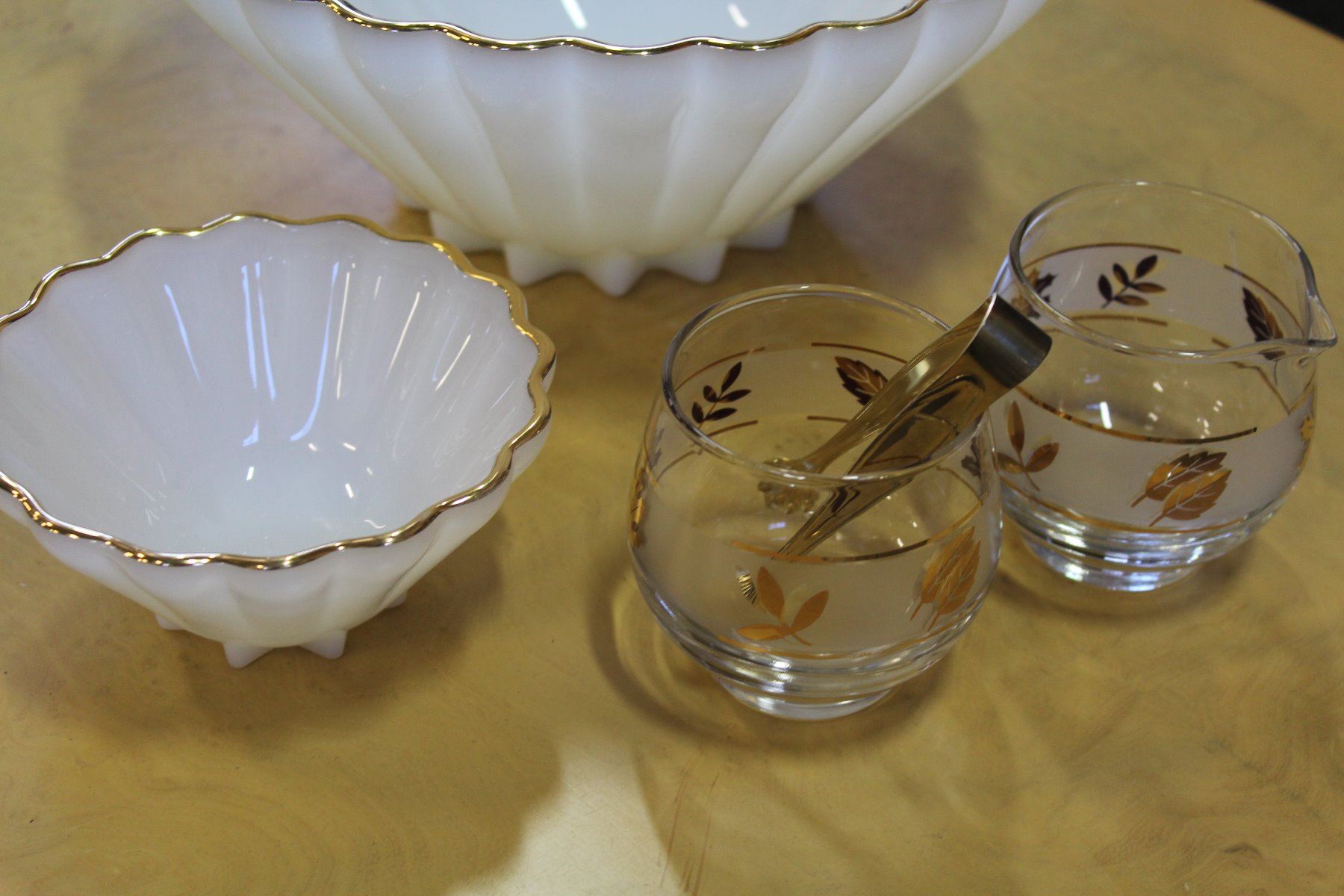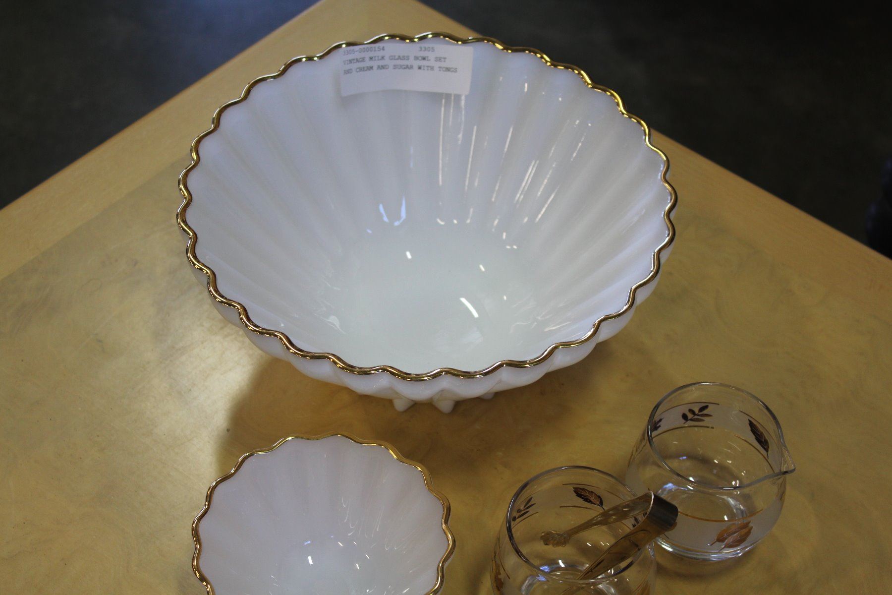 VINTAGE MILK GLASS BOWL SET AND CREAM AND SUGAR WITH TONGS
