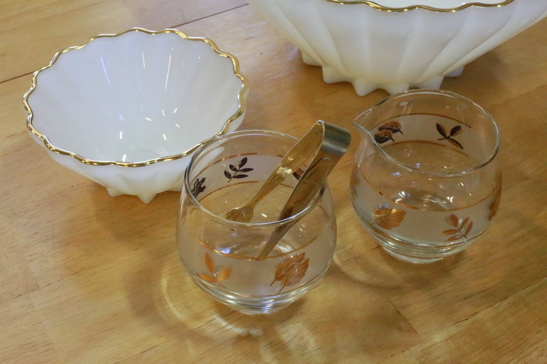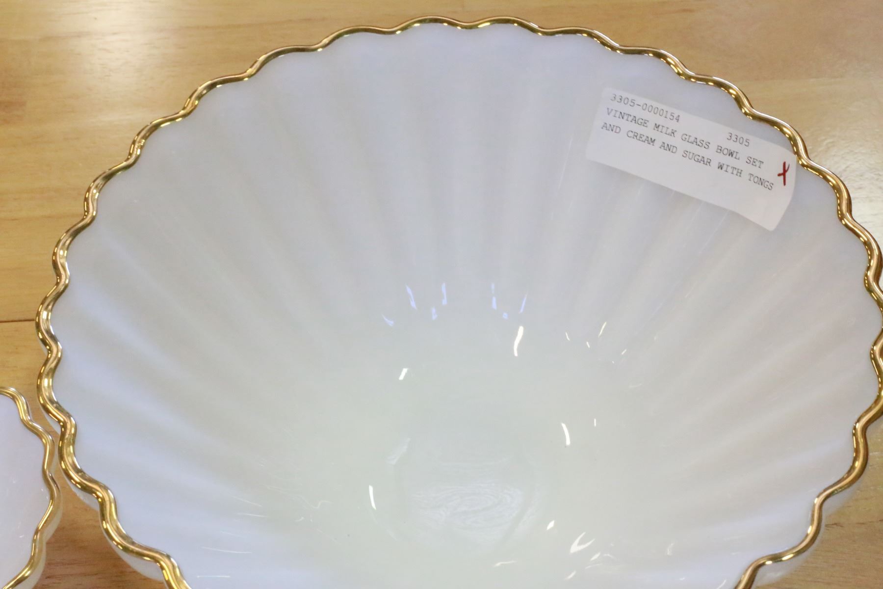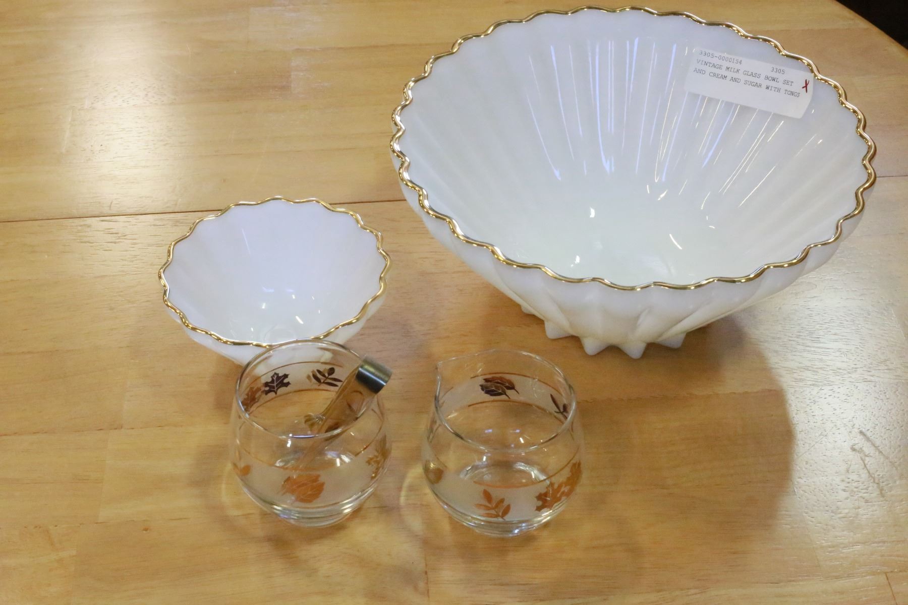 VINTAGE MILK GLASS BOWL SET AND CREAM AND SUGAR WITH TONGS