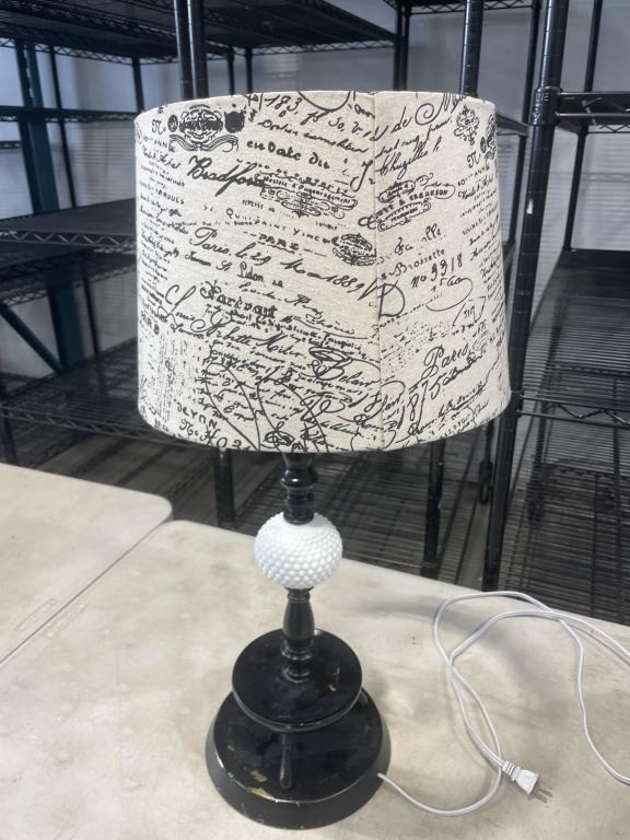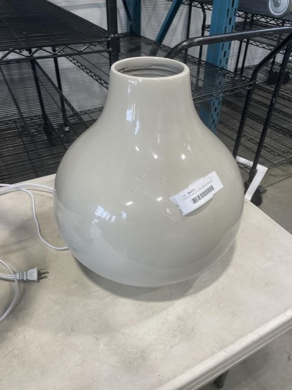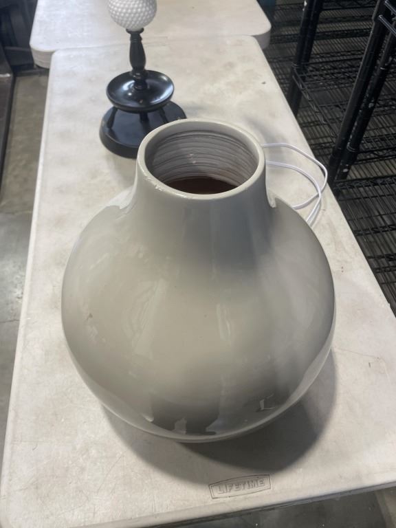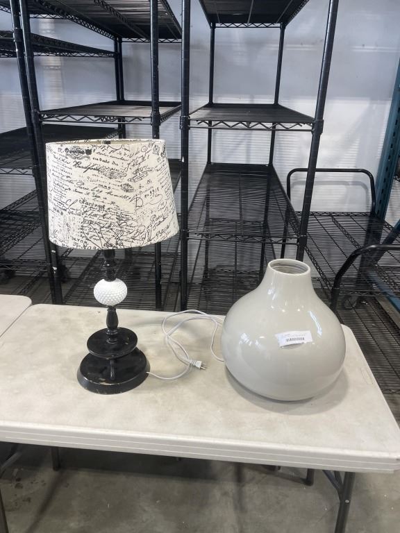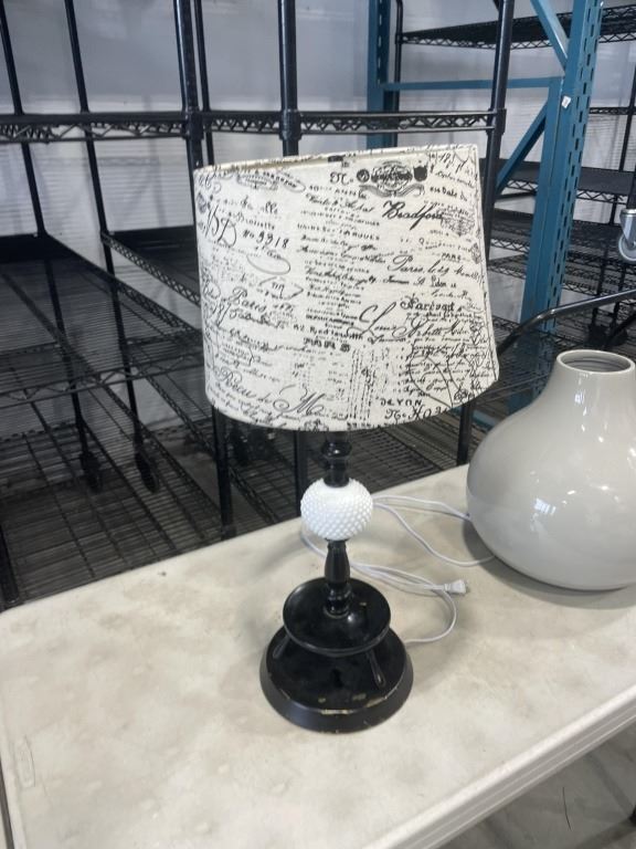 VINTAGE MILK GLASS LAMP AND MODERN GREY VASE