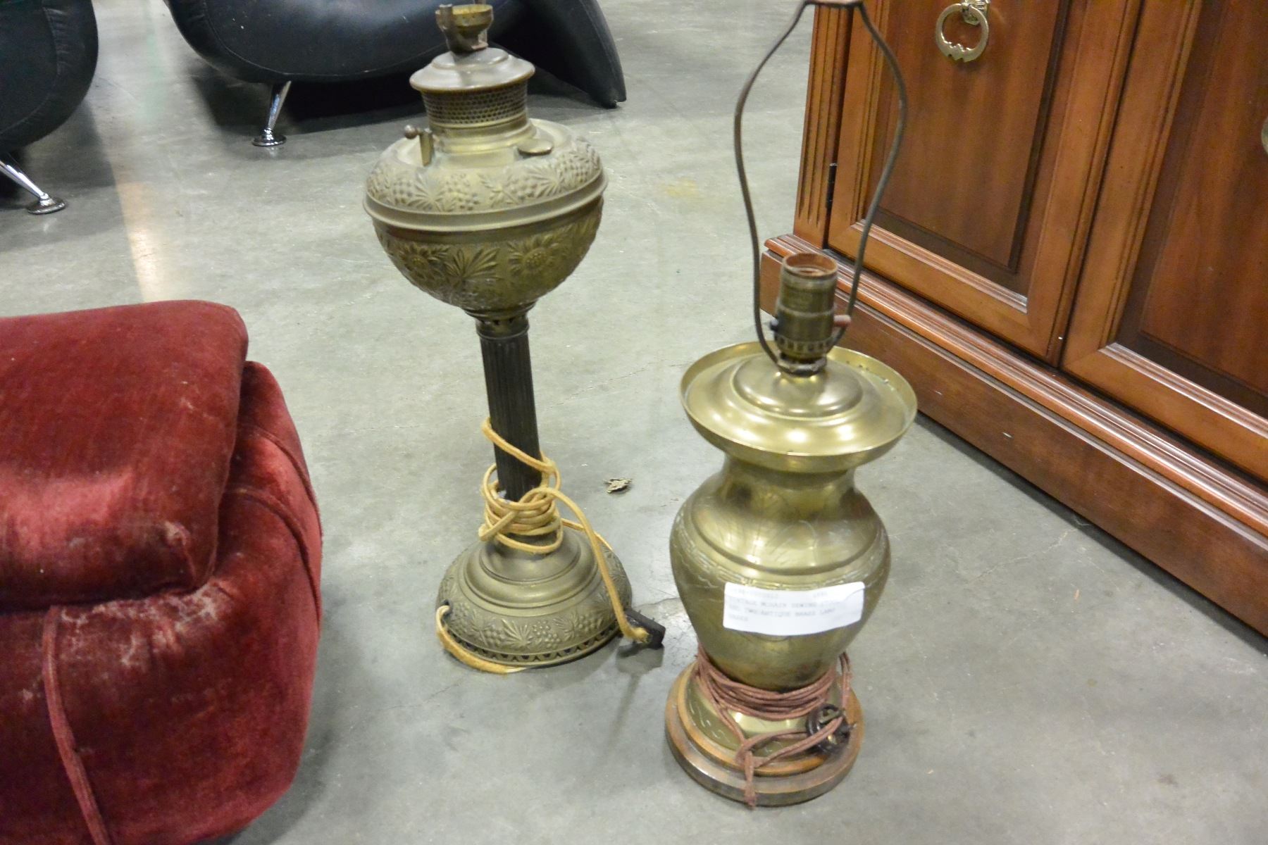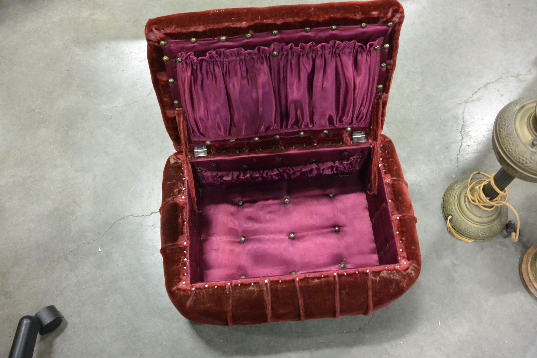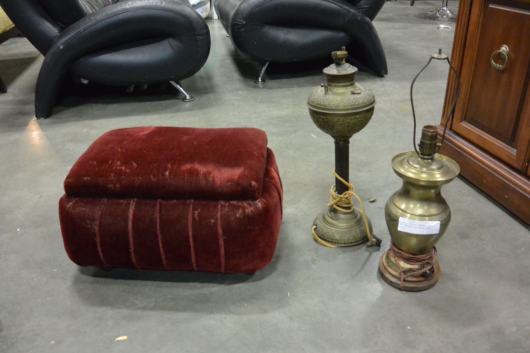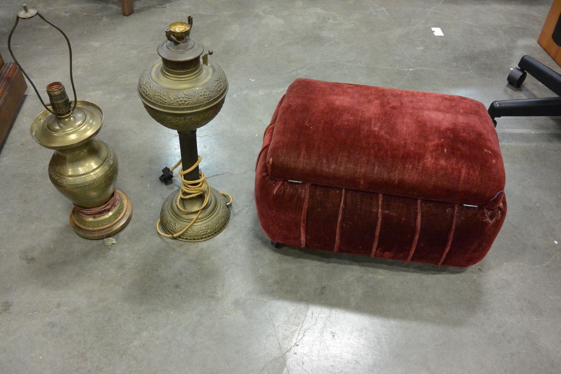 VINTAGE MOHAIR SEWING STOOL AND TWO ANTIQUE BRASS LAMP BASES