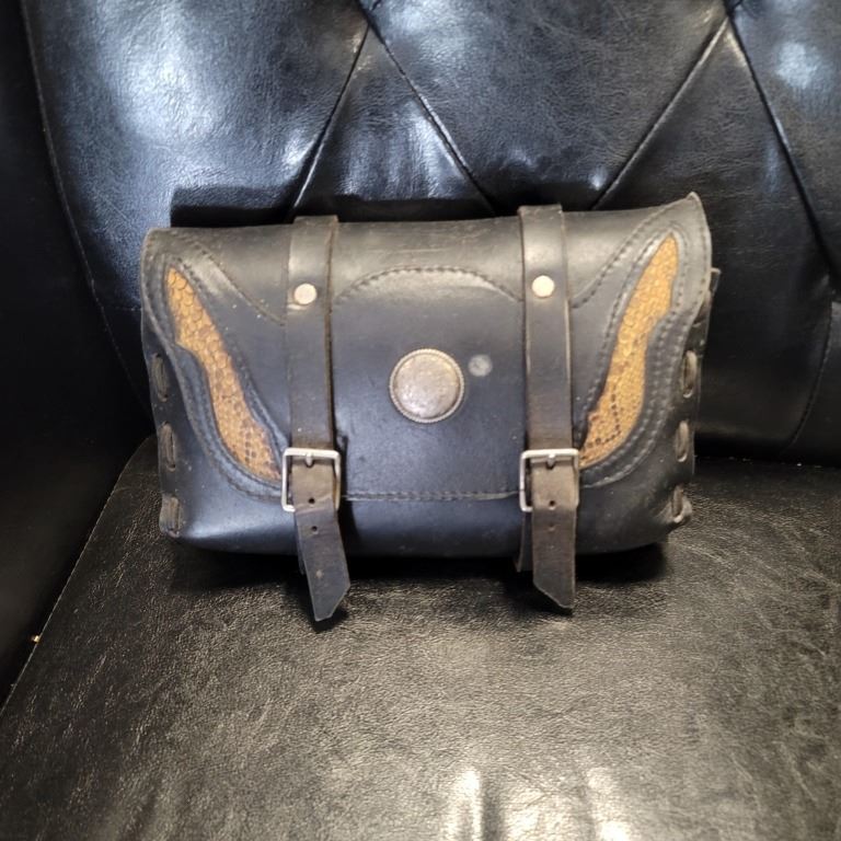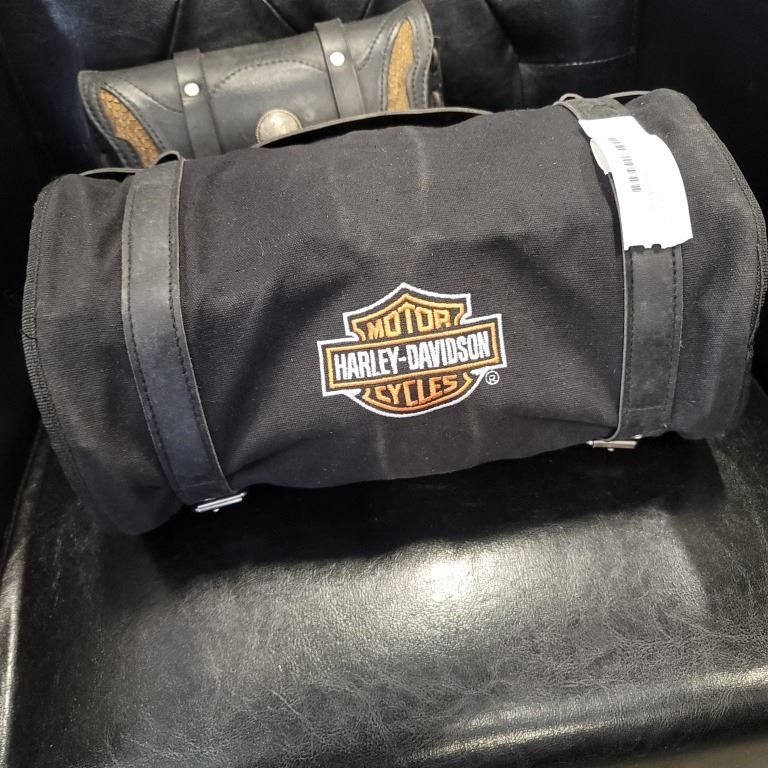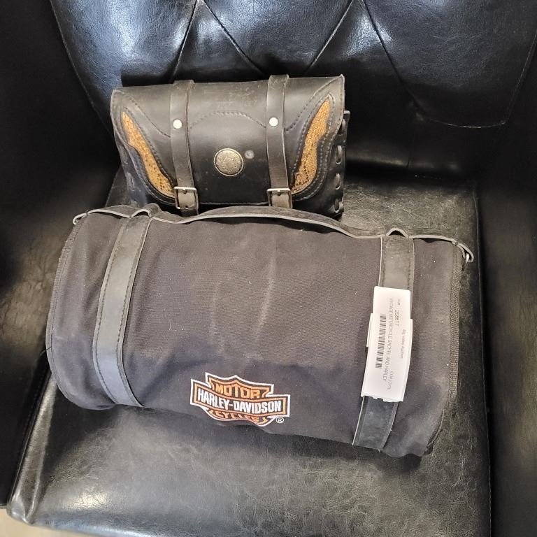 VINTAGE MOTORCYCLE SACHEL AND HARLEY DAVIDSON ROLL UP TOOL BAG