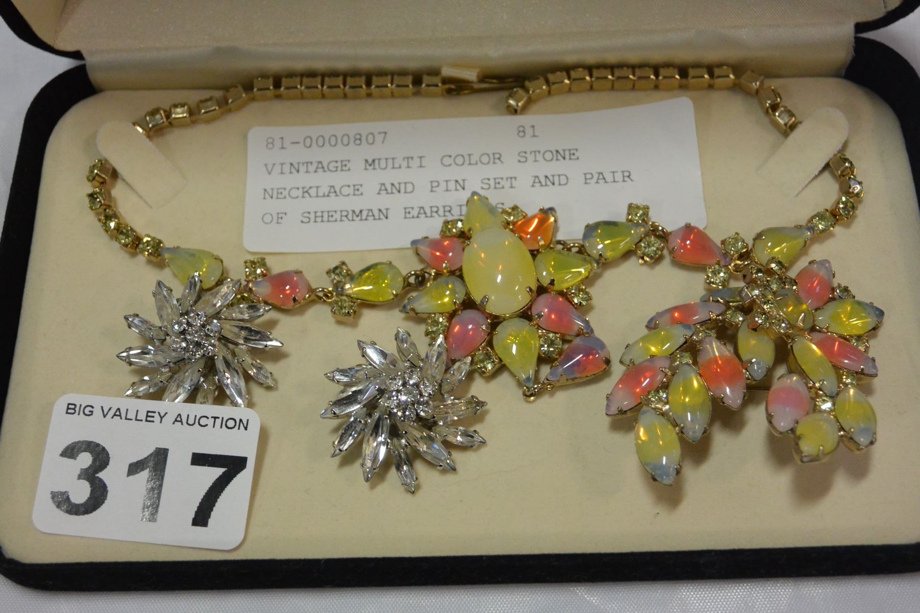 VINTAGE MULTI COLOR STONE NECKLACE AND PIN SET AND PAIR OF SHERMAN EARRINGS