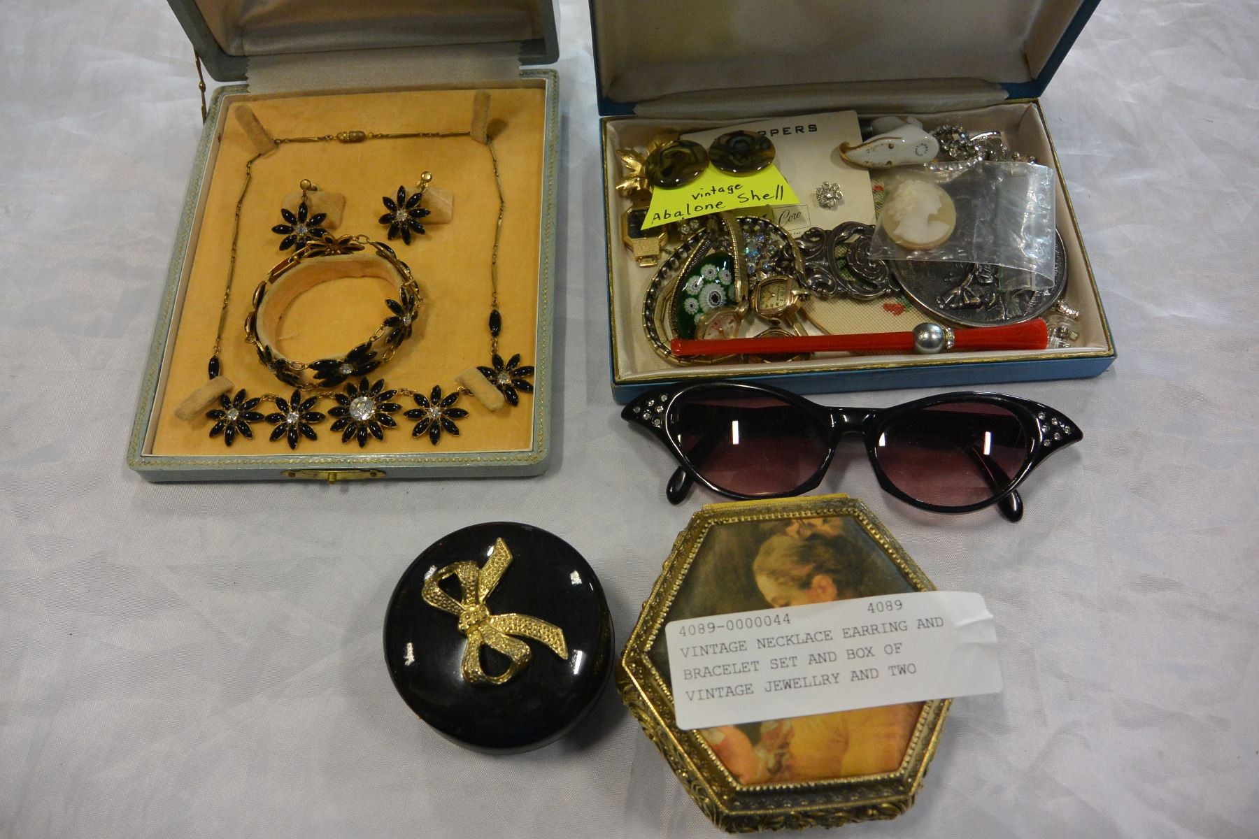 VINTAGE NECKLACE EARRING AND BRACELET SET AND BOX OF VINTAGE JEWELLRY AND TWO DRESSER DISHES