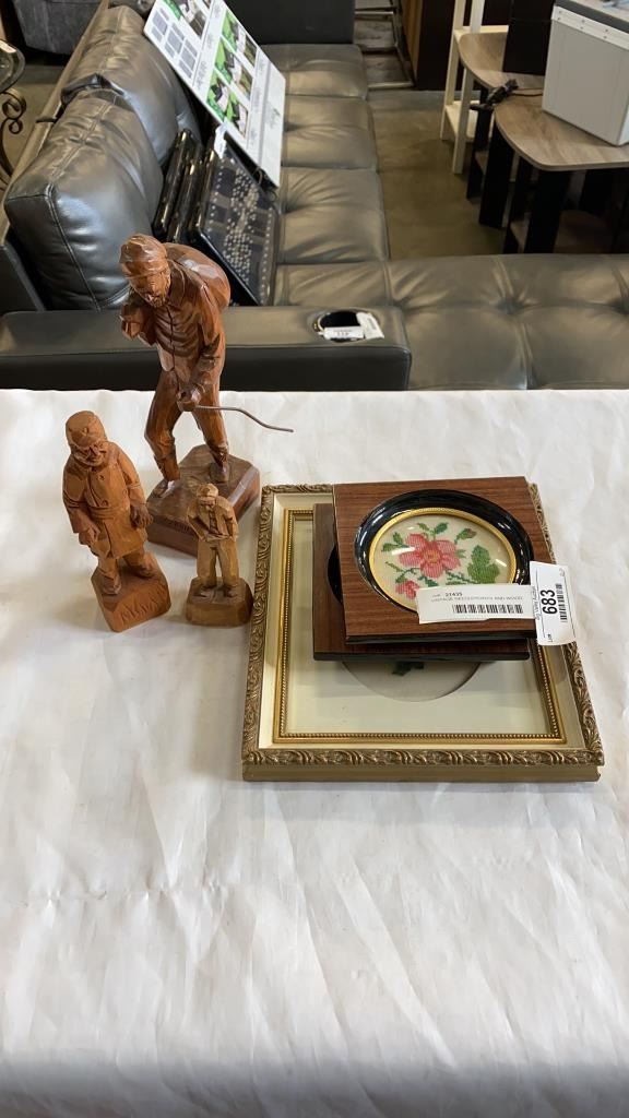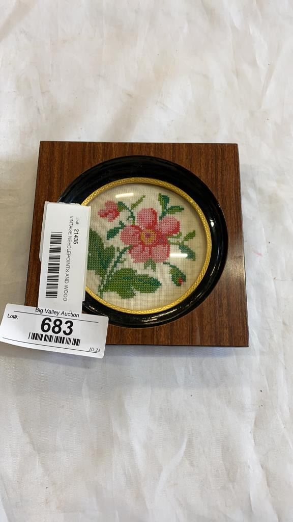 VINTAGE NEEDLEPOINTS AND WOOD FIGURES