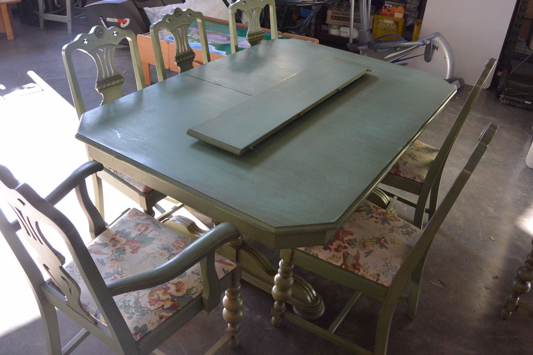 VINTAGE PAINTED SPIESZ FURNITURE TABLE WITH 2 LEAFS AND 6 CHAIRS