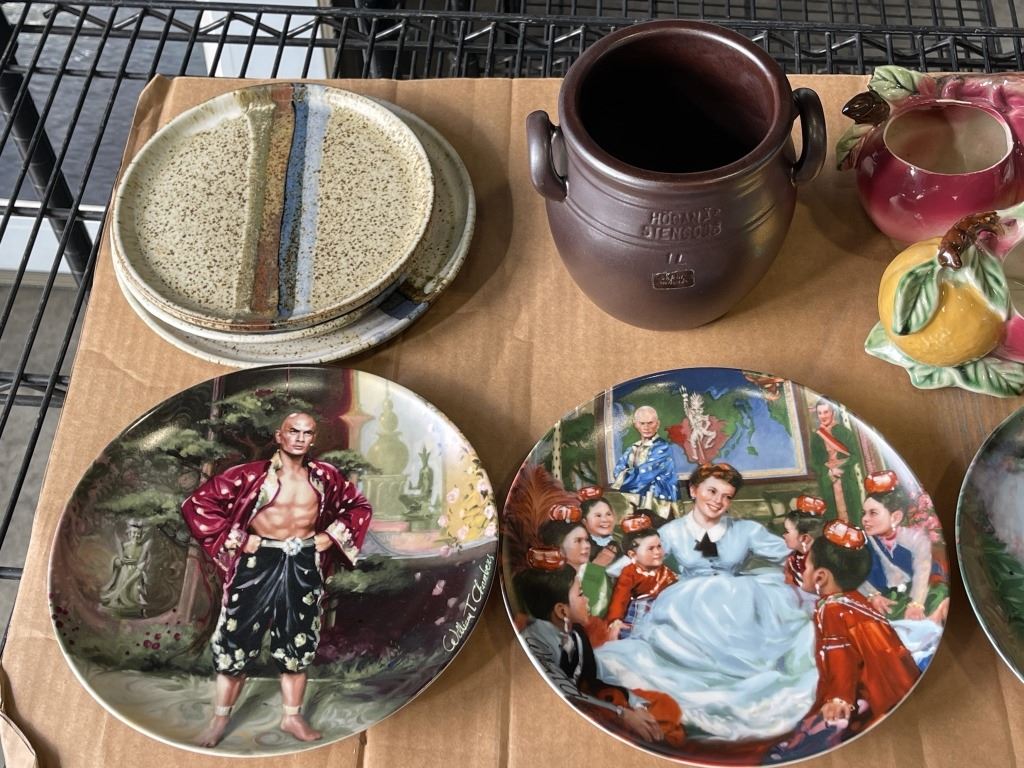 VINTAGE POTTERY PLATES, CROCKS, HAND PAINTED WINDOW PLANTERS, COLLECTOR PLATES ETC