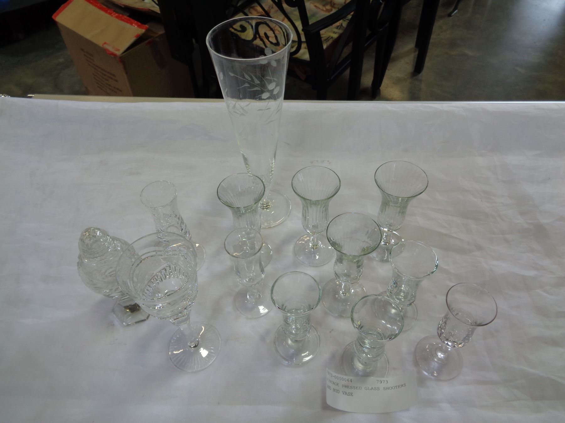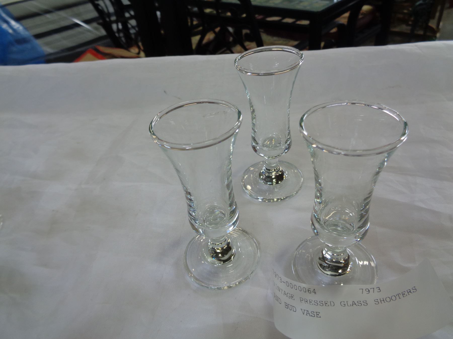 VINTAGE PRESSED GLASS SHOOTERS AND BUD VASE